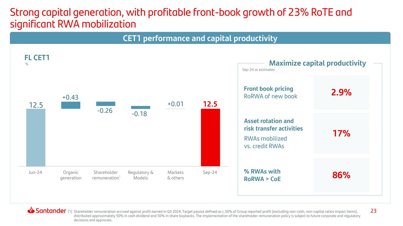 23新书的正面定价RORWA强劲的资本生成,盈利的正面账面增长23% ROTE和显着的RWA动员%(1)2024年第三季度赚取的利润中计提的股东薪酬。目标派息定义为集团报告利润的c.50 %(不包括非现金、非资本比率影响项目),派发约50%的现金股息和50%的股份回购。股东薪酬政策的实施取决于未来公司和监管部门的决定和批准。FL CET1 % RWA with RORWA > CoE Asset Rotation and Risk Transfer Activities RWA mobilized vs. Credit RWA maximizes capital productivity Sep-24 or estimates 86% 17% 2.9% 112.5-0.26-0.18 12.5 + 0.43 + 0.01 Jun-24 organic generation shareholder remuneration regulatory & models Markets & others Sep-24 CET1 performance and capital productivity