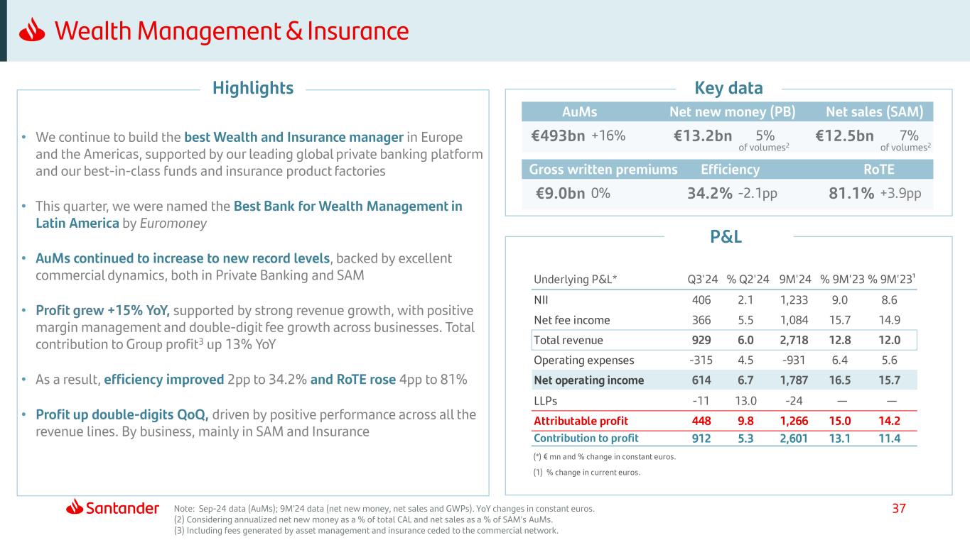 37理财&保险注:Sep-24数据(AUMs);9M'24数据(净新货币、净销售额和GWP)。按不变欧元计算的同比变化。(2)考虑年化净新增资金占CAL总额的百分比和净销售额占SAM资产管理规模的百分比。(三)包括让渡给商业网络的资管、保险产生的费用。•我们继续打造欧洲和美洲最好的财富和保险管理公司,由我们领先的全球私人银行平台以及我们一流的基金和保险产品工厂提供支持•本季度,我们被Euromoney评为拉丁美洲最佳财富管理银行•在私人银行和SAM的出色商业动态的支持下,管理资产规模继续增加到新的创纪录水平•利润同比增长+ 15%,这得益于强劲的收入增长,利润率管理为正,各业务的费用增长达到两位数。对集团利润的总贡献3同比增长13% •因此,效率提高2pp至34.2%,ROTE上升4pp至81% •利润环比增长两位数,这得益于所有收入线的积极表现。按业务划分,主要在SAM和保险基础损益* Q3‘24% Q2’24 9M‘24% 9M’23% 9M ' 23丨NII 4062.11,2339.08.6净手续费收入3665.51,08415.71 4.9总收入9296.02,71812.81 2.0营业费用-315 4.5-931 6.45.6净营业收入6146.71,78716.5 15.7 LLPs-11 13.0-24 ——应占利润4489.81,26615.01 4.2对利润的贡献9125.32,60113.11 1.4(*)欧元和%变化不变欧元。(1)当前欧元变动%。P & L亮点关键数据AUMs净新资金(PB)净销售额(SAM)毛承保保费效率RoTE 4930亿欧元+ 16% 132亿欧元5% 125亿欧元7% 90亿欧元0% 34.2%-2.1pp 81.1% + 3.9pp的成交量2的成交量2