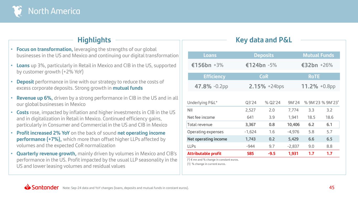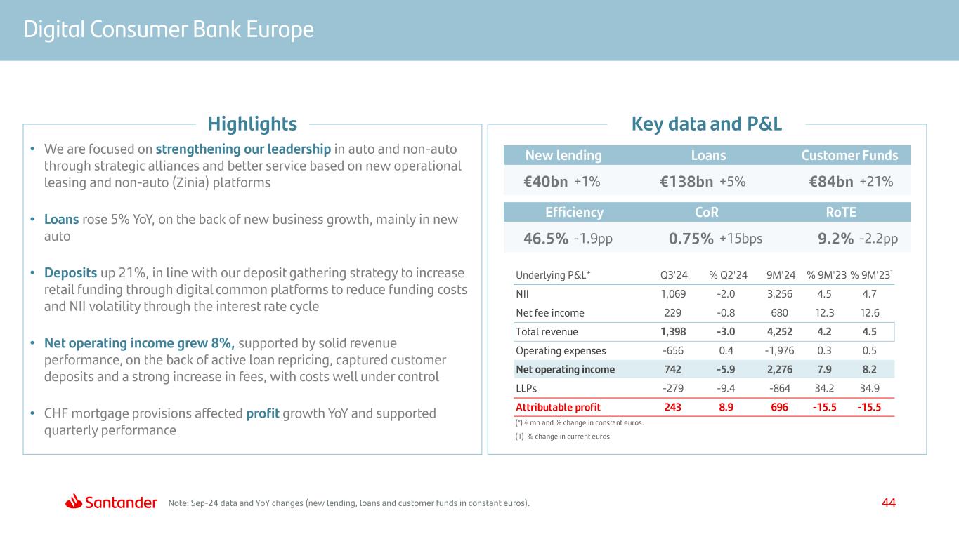 44注:Sep-24数据及同比变化(以不变欧元计的新贷款、贷款和客户资金)。Digital Consumer Bank Europe Highlights Key Data and P & L Underlying P & L * Q3‘24 % Q2’24 9m‘24 % 9m’23 % 9m'23丨NII 1,069-2.0 3,2564.54.7净手续费收入229-0.8 68012.31 2.6总收入1,398-3.0 4,2524.24.5 Operating expenses-656 0.4-1,9760.3 0.5 Net operating income 742-5.9 2,2767.98.2 LLPs-279-9.4-864 34.23 4.9 Attribable profit 2438.96-15.5-15.5(*)mn and % change in constant euros。(1)当前欧元变动%。新贷款客户资金效率CoR RoTE •我们专注于通过战略联盟和基于新的运营租赁和非汽车(Zinia)平台的更好服务来加强我们在汽车和非汽车领域的领导地位•贷款同比增长5%,这得益于新业务增长,主要是在新汽车领域•存款增长21%,这符合我们的存款聚集战略,即通过数字通用平台增加零售资金,以降低融资成本和利率周期中的NII波动性•净营业收入增长8%,这得益于稳健的收入表现,在积极的贷款重定价、捕获客户存款和费用强劲增长的背景下,成本得到良好控制•瑞郎抵押贷款拨备影响利润同比增长,并支持季度业绩400亿欧元+ 1% 1380亿欧元+ 5% 840亿欧元+ 21% 46.5%-1.9pp 0.75% + 15bps 9.2%-2.2pp