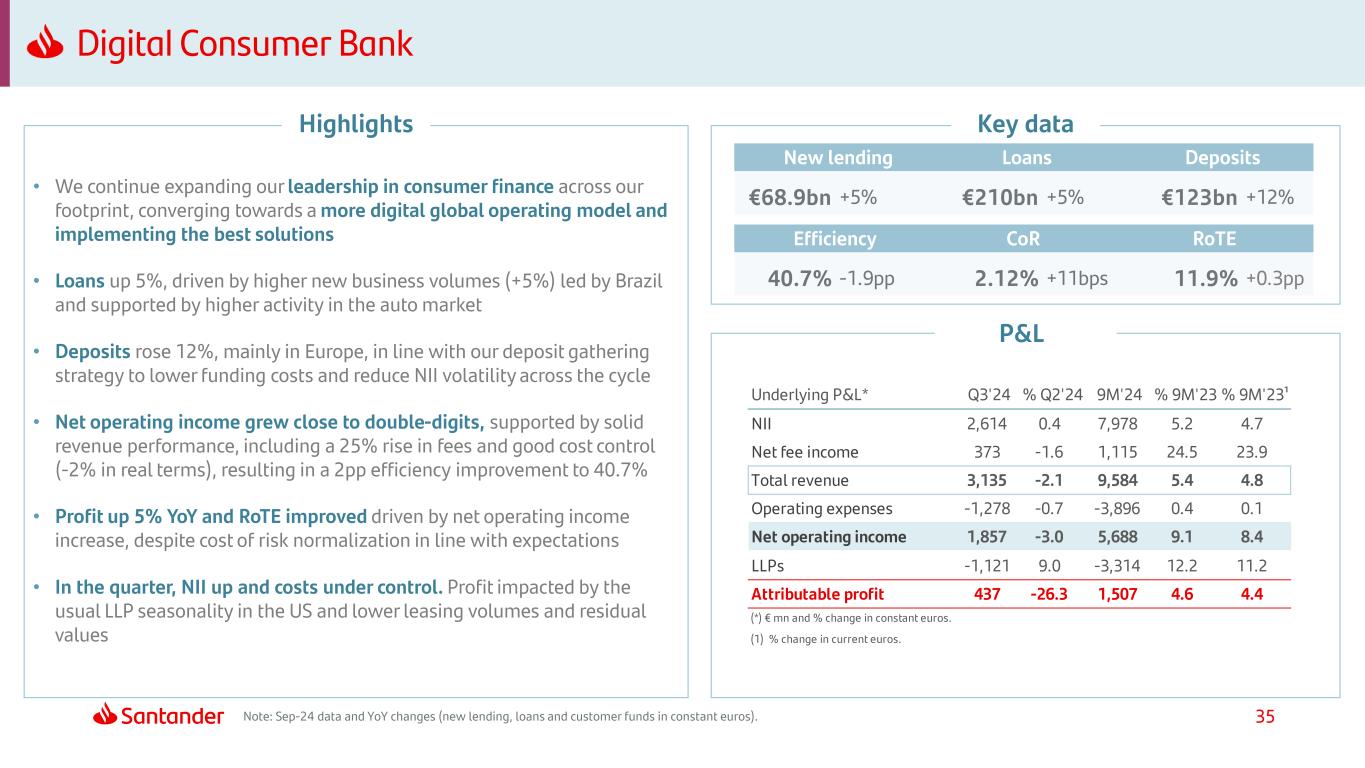 34贷款存款共同基金效率CoR RoTE P & L零售和商业银行业务突出基础P & L * Q3‘24% Q2’24 9m‘24 % 9m’23 % 9m'23丨NII 6,803 2.320,8179.59.0净手续费收入1,1492.63,5142.7 0.9总收入7,9450.024,2199.08.3营业费用-3,1023.1-9,525-1.0-2.2净营业收入4,844-1.9 14,69416.8 16.3 LLPs-1,369-7.1-4,456-5.5-7.4归属利润2,00512.65,33228.62 9.2(*)欧元和%变化不变欧元。(1)当前欧元变动%。关键数据6140亿欧元-1 % 6380亿欧元+ 1% 950亿欧元+ 16% 39.3%-4.2pp 0.98% + 3bps 18.5% + 3.6pp注:Sep-24数据和同比变化(以固定欧元计的贷款、存款和共同基金)。•我们的转型体现在客户总数显著上升(+ 4% YoY)、效率提升(-4pp至39.3%)和更高的盈利能力(+ 4pp至18.5%)•贷款同比略有下降,仍受到欧洲抵押贷款和中小企业预付款的影响,大部分被南美和墨西哥的增长所抵消。存款和共同基金普遍增加•利润同比强劲增长(+ 29%),各地区收入表现稳健,成本和LLP下降:-NII在各地区均有所上升,但尤其是在南美(交易量和存款成本较低)以及西班牙和葡萄牙(保证金管理)-费用表现稳健。值得注意的是,巴西(保险和外汇)、美国(服务费)、墨西哥(保险和基金)和波兰(外汇和基金)—— LLP改善,CoR稳定,因为欧洲的良好表现抵消了巴西销量增加以及墨西哥和智利正常化的影响•利润环比增长13%,这是由于较高的NII(巴西、波兰、英国和墨西哥)、较低的LLP(西班牙和北美)以及在第二季度录得瑞郎拨备后