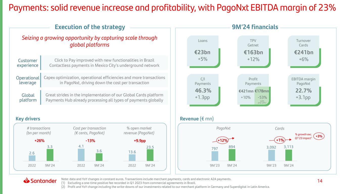 增长14%不含税。Q1’23 impact1关键驱动因素通过全球平台获取规模,抓住不断增长的机遇收入(百万欧元)PagoNXT卡注:数据和同比变化,单位为不变欧元。交易包括商户支付、卡和电子A2A支付。(1)不包括2023年第一季度从巴西的商业协议中记录的一次性正费用。(2)利润和同比变化,包括我们在德国的商家平台和拉丁美洲的Superdigital相关投资的减记。每笔交易成本(欧元美分,PagoNXT)%公开市场收入(PagoNXT)#交易(每月10亿)支付:稳健的收入增长和盈利能力,PagoNXT EBITDA利润率为23%战略执行+ 26%-13 % + 9.9pp + 12% + 1% Click to Pay在巴西通过新功能得到改进墨西哥城地下网络中的非接触式支付客户体验Capex优化、运营效率和更多交易在PagoNXT,推动降低每笔交易成本在实施我们的全球卡平台Payments Hub方面取得长足进步,已在全球范围内处理所有类型的支付运营杠杆全球平台Profit Payments Loans TPV Getnet周转卡EBITDA margin PagoNxt C/I Payments with one-offs2 9m‘24 financials欧元2410亿+ 6% 46.3% + 1.3pp 22.7% + 3.1pp欧元4.21亿+ 10%-53 % 2.6 3.320229m’244.11.620229m‘2413.62 3.520229m’24 797894 9m‘23 9m’243,0923,113 9m‘23 9m’24欧元1.78亿+ 3% 1630亿欧元+ 12% 230亿欧元+ 5%