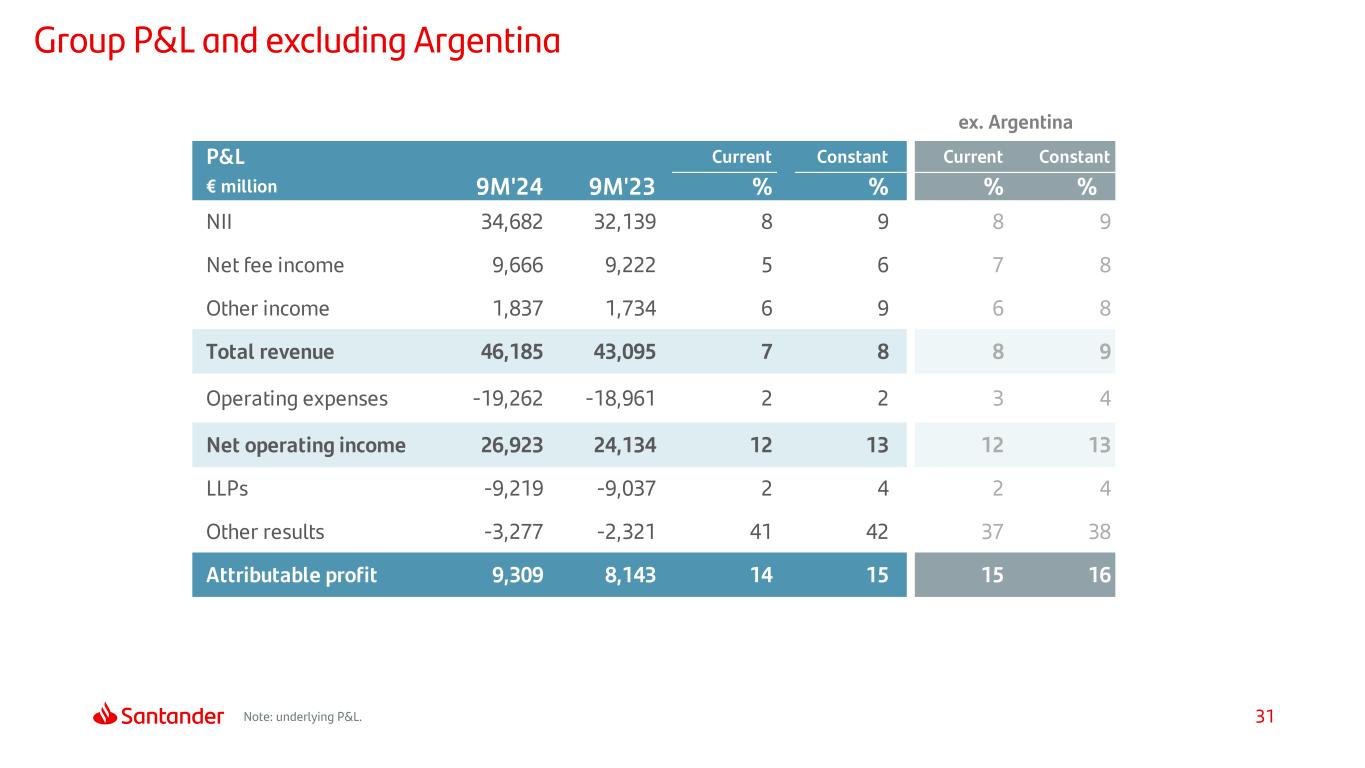 31集团损益和不包括阿根廷ex。阿根廷P & L Current Constant Current Constant EUR million 9m‘24 9m’23%%%% NII 34,68232,139889净手续费收入9,6669,2225678其他收入1,8371,7346968总收入46,18543,0957889营业费用-19,262-18,9612234净营业收入26,92324,13412131213 LLPs-9,219-9,0372424其他业绩-3,277-2,32141423738归属利润9,3098,14314151516注:基础损益。