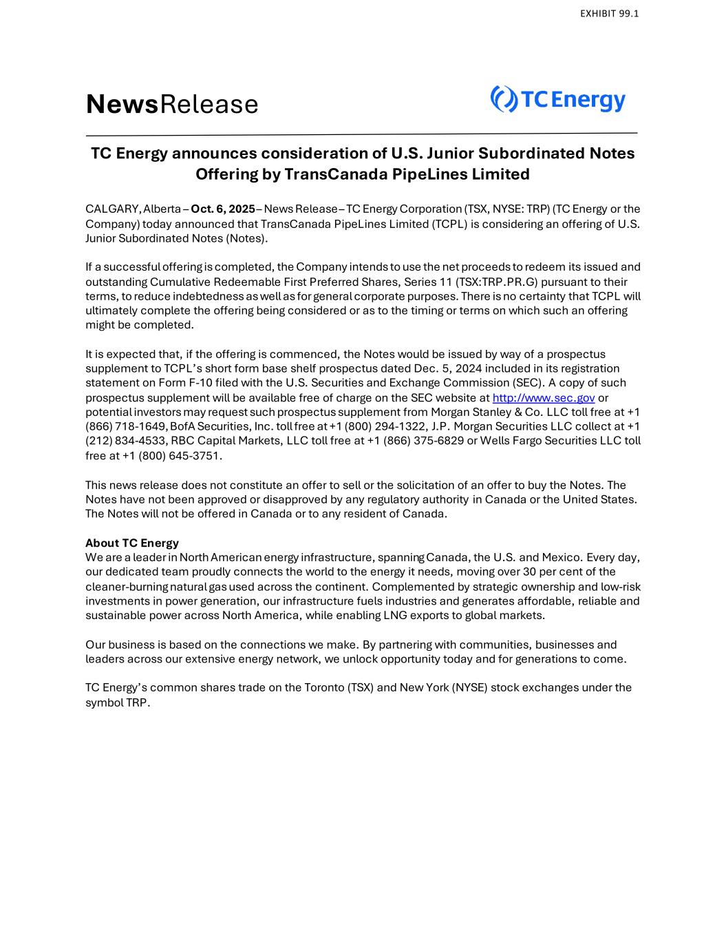 NewsRelease TC Energy宣布考虑由TransCanada PipeLines Limited发行美国初级次级票据艾伯塔省卡尔加里– 2025年10月6日– News Release – TC Energy Corporation(TSX,NYSE:TRP)(TC Energy或公司)今天宣布,TransCanada PipeLines Limited(TCPL)正在考虑发行美国初级次级票据(票据)。如果发行成功,公司打算根据条款将所得款项净额用于赎回其已发行和未偿还的累积可赎回第一优先股系列11(多伦多证券交易所代码:TRP.PR.G),以减少债务以及用于一般公司用途。无法确定TCPL最终是否会完成正在考虑的发行,也无法确定完成此类发行的时间或条款。预计,如果开始发行,这些票据将通过TCPL向美国证券交易委员会(SEC)提交的F-10表格注册声明中包含的日期为2024年12月5日的简式基本货架招股说明书的招股说明书补充的方式发行。此类招股说明书补充文件的副本将在SEC网站http://www.sec.gov上免费提供,或者潜在投资者可以向摩根士丹利 & Co. LLC索取此类招股说明书补充文件,免费电话+ 1(866)718-1649,BoFA Securities,Inc.免费电话+ 1(800)294-1322,J.P. Morgan Securities LLC免费电话+ 1(212)834-4533,RBC Capital Markets,LLC免费电话+ 1(866)375-6829或免费电话+ 1(800)645-3751。本新闻稿不构成出售要约或购买票据的要约邀请。票据未获加拿大或美国任何监管机构批准或不批准。票据将不会在加拿大或向任何加拿大居民发售。关于TC Energy我们是北美能源基础设施领域的领先企业,业务遍及加拿大、美国和墨西哥。每天,我们敬业的团队都自豪地将世界与其所需的能源连接起来,将超过30%的清洁燃烧天然气用于整个非洲大陆。辅之以战略所有权和对发电的低风险投资,我们的基础设施为工业提供燃料,并在北美各地产生负担得起、可靠和可持续的电力,同时使液化天然气能够出口到全球市场。我们的业务是基于我们建立的联系。通过与我们广泛的能源网络中的社区、企业和领导者合作,我们为今天和子孙后代解锁了机会。TC Energy的普通股在多伦多(TSX)和纽约(NYSE)证券交易所交易,代码为TRP。展览99.1