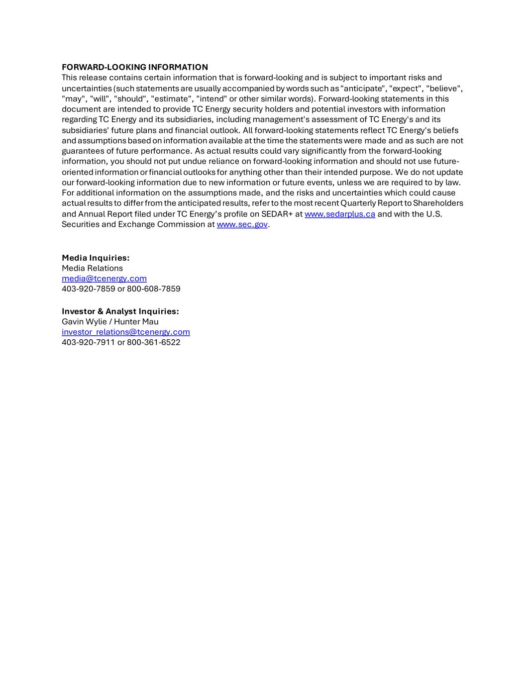 前瞻性信息本新闻稿包含某些具有前瞻性并受到重要风险和不确定性影响的信息(此类陈述通常附有“预期”、“预期”、“相信”、“可能”、“将”、“应该”、“估计”、“打算”或其他类似词语)。本文件中的前瞻性陈述旨在为TC Energy证券持有人和潜在投资者提供有关TC Energy及其子公司的信息,包括管理层对TC Energy及其子公司未来计划和财务前景的评估。所有前瞻性陈述都反映了TC Energy基于做出这些陈述时可获得的信息的信念和假设,因此不能保证未来的业绩。由于实际结果可能与前瞻性信息有很大差异,您不应过分依赖前瞻性信息,也不应将面向未来的信息或财务前景用于其预期目的以外的任何事情。我们不会因新信息或未来事件而更新我们的前瞻性信息,除非法律要求我们这样做。有关所做假设的更多信息,以及可能导致实际结果与预期结果不同的风险和不确定性,请参阅最近的股东季度报告和根据TC Energy在SEDAR +上的简介(www.sedarplus.ca)以及在美国证券交易委员会(www.sec.gov)上提交的年度报告。媒体查询:Media Relations media@tCENergy.com 403-920-7859或800-608-7859投资者及分析师查询:Gavin Wylie/Hunter Mau investor _ relations@tCENergy.com 403-920-7911或800-361-6522