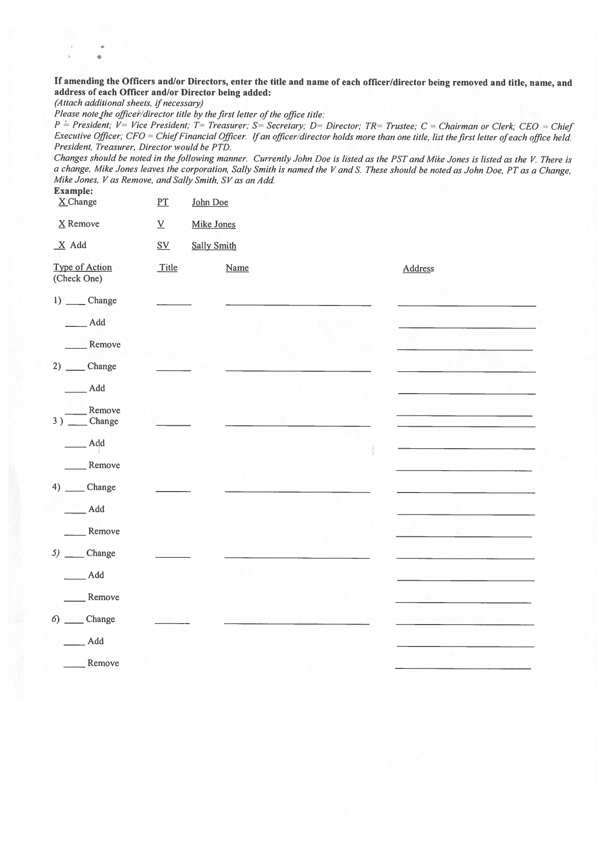 1)变更添加删除更改添加2)删除更改3)添加删除更改4)添加删除更改添加5)删除更改d)添加删除如果修改高级职员和/或董事,请输入每名被删除的高级职员/董事的头衔和姓名以及每名被添加的高级职员和/或董事的头衔、姓名、地址:(如有必要,附上附加表格y)请在办公室头衔的第一个字母处注明高级董事的头衔。P‘总裁、V副总裁、T财务主管、S Secretai y;D董事、T R受托人;C董事长或Clei k,’CE O首席执行官、CF O首席财务官。如果一个高级董事拥有一个以上的头衔,列出每个办公室担任总裁的第一封信,财务-er,董事将是PTD。应通过以下方式注意到变化。目前John Doe被列为PST,Mike Jones被列为V。发生变化,Mike Jones离开公司,Sally Smith被命名为V和S。这些应该被注意到为John Doe,PT为变化,Mike Jones,V为Remove,而Sally Smith,SV为add。示例:XChange PT John Doe X移除V Mike Jones X添加动作标题Name(勾选一)的SV Sally Smith Twe地址