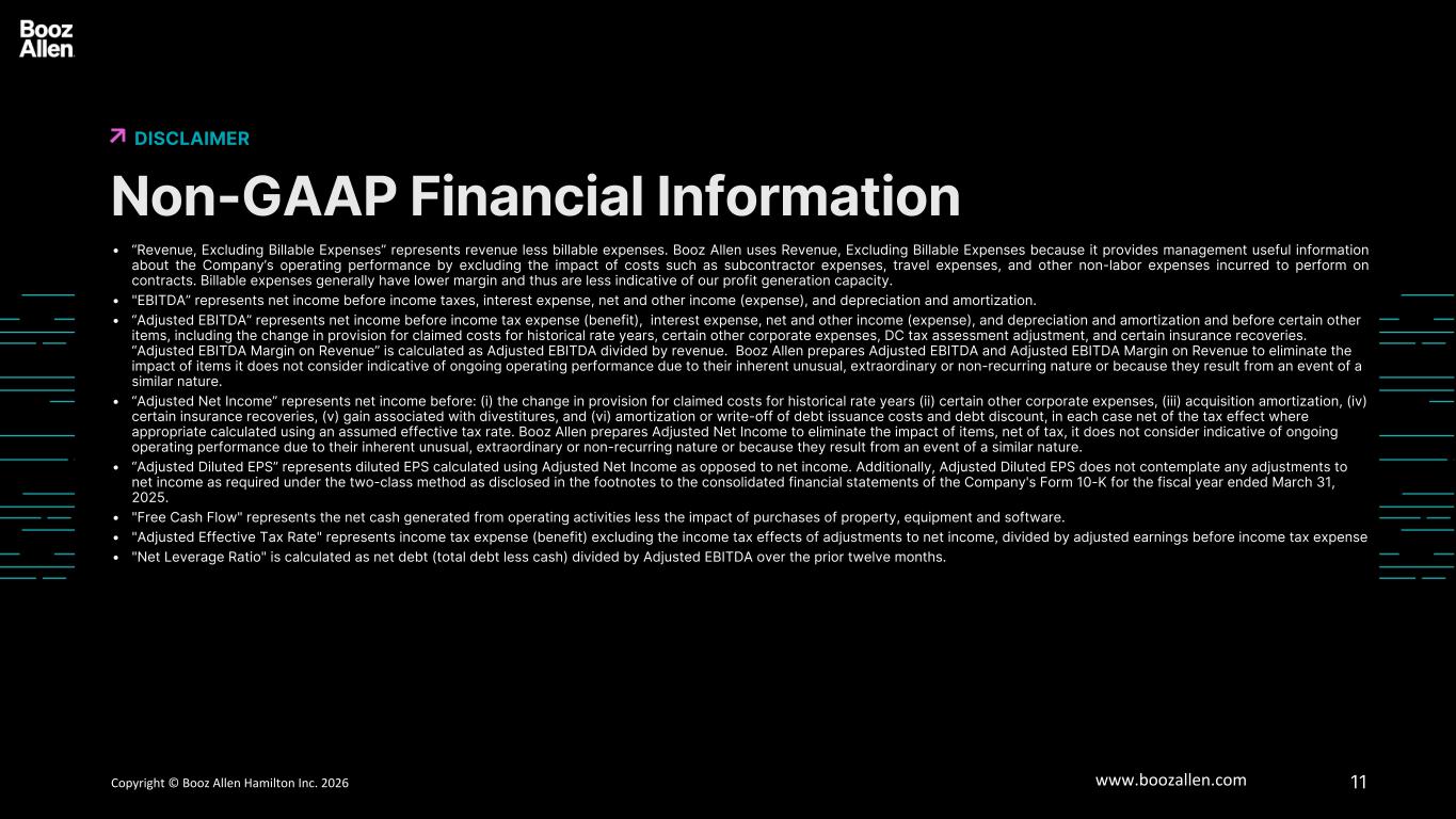 10版权所有©博思艾伦咨询 Inc. 2025 www.boozallen.com第三季度(1)年初至今(1)收入26亿美元(10.2)% 84亿美元(6.3)%收入,不包括可结算费用18亿美元(6.7)% 59亿美元(4.7)%净收入2亿美元+ 7.0% 6.46亿美元(12.9)%调整后EBITDA(2)2.85亿美元(14.2)% 9.2亿美元(7.8)%调整后EBITDA收入利润率(2)10.9%-50个基点10.9%-20个基点调整后净利润2.15亿美元+ 8.6% 5.82亿美元(4.6)%稀释后每股收益1.63美元+ 12.4% 5.22美元(8.9)%调整后稀释后每股收益1.77美元+ 14.2% 4.74 —%经营活动提供的净现金2.61亿美元+ 72.8% 8.01亿美元+ 1.4% 博思艾伦咨询受限2026财年第三季度和年初至今业绩主要财务结果6(1)与上一财年期间进行比较。(2)调整后EBITDA和调整后EBITDA利润率对收入的调节可在幻灯片12中找到。截至2025年12月31日止三个月和九个月的净利润率分别为7.6%和7.7%。