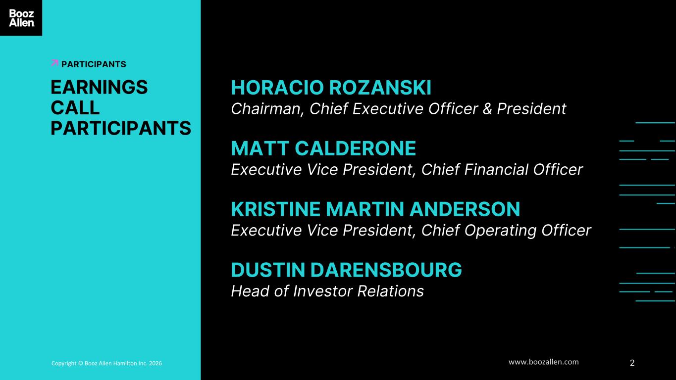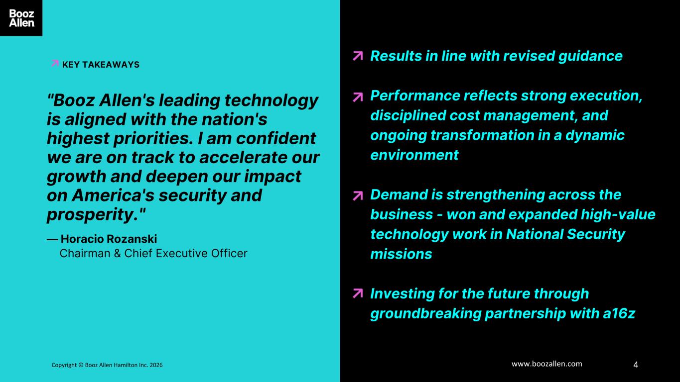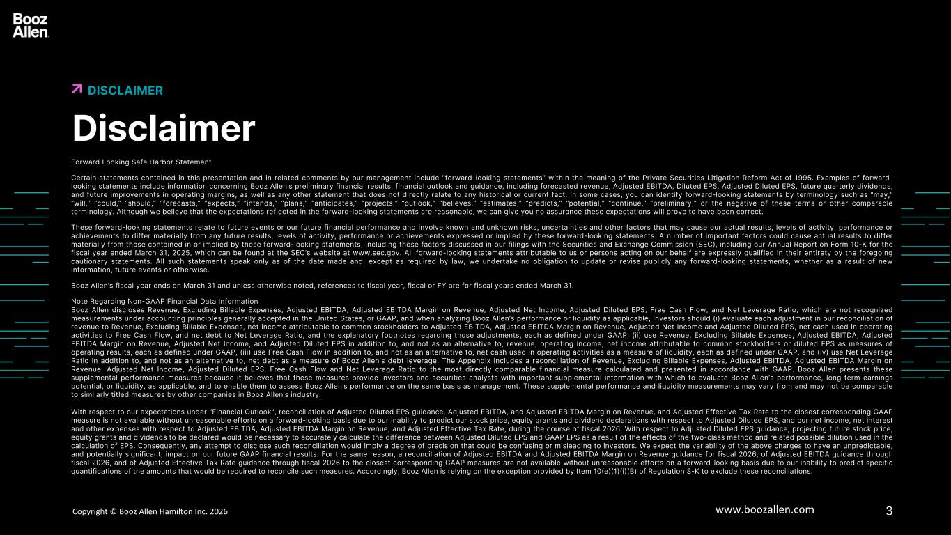 3版权©博思艾伦咨询 Inc. 2025 www.boozallen.com 博思艾伦咨询有限制的免责声明免责声明6前瞻安全港声明本演示文稿中包含的某些陈述以及我们管理层的相关评论中包含的某些陈述包括1995年《私人证券诉讼改革法案》含义内的“前瞻性陈述”。前瞻性陈述的例子包括有关博思艾伦初步财务业绩、财务前景和指导的信息,包括预测收入、调整后EBITDA、稀释后每股收益、调整后稀释后每股收益、未来季度股息、未来营业利润率的改善,以及与任何历史或当前事实没有直接关系的任何其他陈述。在某些情况下,您可以通过“可能”、“将”、“可能”、“应该”、“预测”、“预期”、“打算”、“计划”、“预期”、“项目”、“前景”、“相信”、“估计”、“预测”、“潜在”、“继续”、“初步”等术语来识别前瞻性陈述,或者这些术语或其他类似术语的否定。尽管我们认为前瞻性陈述中反映的预期是合理的,但我们不能向您保证这些预期将被证明是正确的。这些前瞻性陈述涉及未来事件或我们未来的财务业绩,涉及已知和未知的风险、不确定性和其他因素,可能导致我们的实际结果、活动水平、业绩或成就与这些前瞻性陈述明示或暗示的任何未来结果、活动水平、业绩或成就存在重大差异。许多重要因素可能导致实际结果与这些前瞻性陈述中包含或暗示的结果存在重大差异,包括我们在提交给美国证券交易委员会(SEC)的文件中讨论的那些因素,包括我们截至2025年3月31日的财政年度的10-K表格年度报告,该报告可在SEC网站www.sec.gov上找到。所有可归因于我们或代表我们行事的人的前瞻性陈述都完全受到上述警示性陈述的明确限定。所有此类声明仅在作出之日发表,除法律要求外,我们不承担公开更新或修改任何前瞻性声明的义务,无论是由于新信息、未来事件或其他原因。博思艾伦的财政年度于3月31日结束,除非另有说明,财政年度、财政年度或财政年度指的是截至3月31日的财政年度。关于非公认会计准则财务数据信息的说明博思艾伦披露的收入,不包括可结算费用、调整后EBITDA、调整后EBITDA收入利润率、调整后净收入、调整后稀释每股收益、自由现金流和净杠杆率,根据美国普遍接受的会计原则或公认会计准则,这些都不是公认的衡量标准,在分析博思艾伦的业绩或流动性(如适用)时,投资者应(i)评估我们对收入与收入进行调节时的每一次调整,不包括可结算费用、归属于普通股股东的净收入与调整后EBITDA、调整后EBITDA收入利润率、调整后净利润和调整后稀释每股收益,经营活动中使用的净现金与自由现金流、净债务与净杠杆比率,以及关于这些调整的解释性脚注,每一项都在GAAP下定义,(ii)使用不包括可结算费用的收入、调整后的EBITDA、调整后的EBITDA收入利润率、调整后的净收入和调整后的稀释每股收益,作为衡量经营业绩的补充,而不是替代,收入、营业收入、归属于普通股股东的净利润或稀释每股收益,每一项都在GAAP下定义,(iii)使用自由现金流作为补充,而不是替代,经营活动中使用的净现金作为流动性的衡量标准,每一项都在GAAP下定义,(iv)使用净杠杆率作为净债务的补充,而不是替代净债务,作为博思艾伦债务杠杆的衡量标准。附录包括收入的对账,不包括可结算费用、调整后EBITDA、调整后EBITDA收入利润率、调整后净收入、调整后稀释每股收益、自由现金流和净杠杆率与按照公认会计原则计算和列报的最直接可比财务指标。博思艾伦提出了这些补充业绩衡量标准,因为它认为这些衡量标准为投资者和证券分析师提供了重要的补充信息,可用于评估博思艾伦的业绩、长期盈利潜力或流动性(如适用), 并使他们能够在与管理层相同的基础上评估博思艾伦的表现。这些补充业绩和流动性衡量标准可能与博思艾伦行业其他公司的类似标题衡量标准不同,也可能无法与之相比。关于我们在“财务展望”下的预期,由于我们无法预测调整后稀释每股收益的股价、股权授予和股息宣布,以及我们在2026财年期间与调整后EBITDA、调整后EBITDA收入利润率和调整后有效税率相关的净收入、净利息和其他费用。关于调整后稀释每股收益指引,预测未来股价、股权授予和将宣布的股息将是必要的,以准确计算调整后稀释每股收益和GAAP每股收益之间的差异,这是由于计算每股收益时使用的两类方法和相关可能稀释的影响。因此,任何披露此类对账的尝试都将意味着一定程度的精确度,这可能会对投资者造成混淆或误导。我们预计上述费用的可变性将对我们未来的GAAP财务业绩产生不可预测的、潜在的重大影响。出于同样的原因,如果不在前瞻性基础上做出不合理的努力,就无法对调整后EBITDA和调整后EBITDA利润率的2026财年收入指导、调整后EBITDA指导到2026财年以及调整后有效税率指导与最接近的相应GAAP衡量标准进行调节,因为我们无法预测协调此类衡量标准所需金额的具体量化。因此,博思艾伦正依靠S-K条例第10(e)(1)(i)(b)项规定的例外情况来排除这些对账。