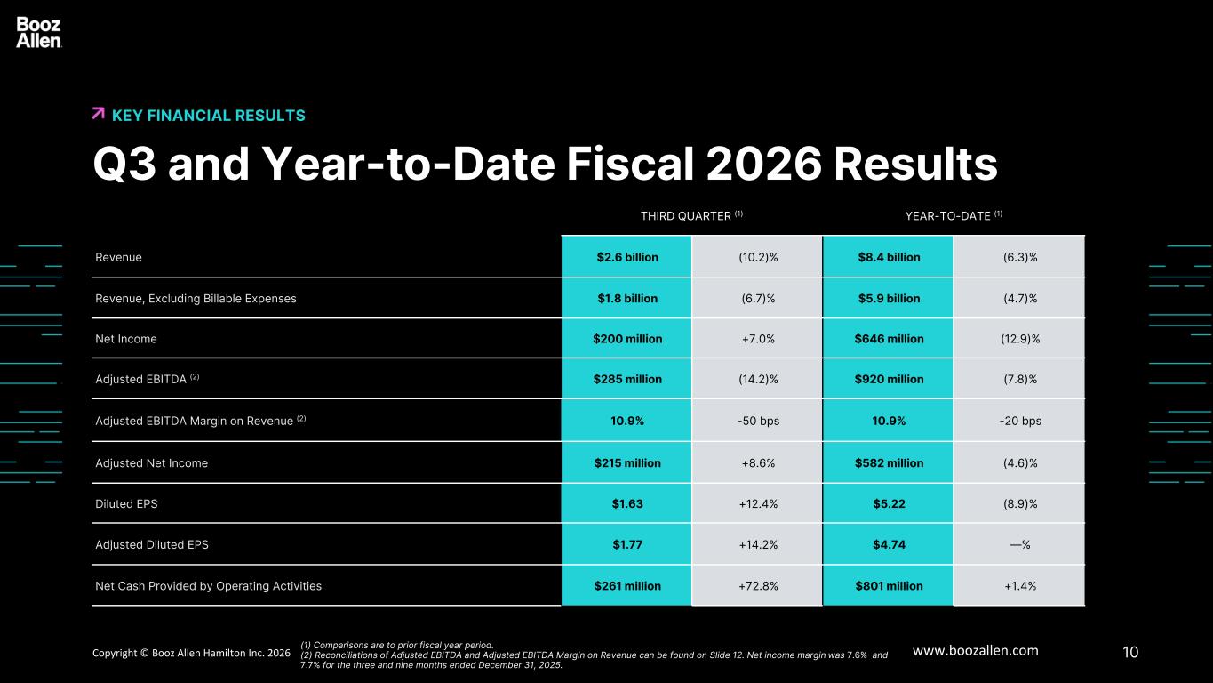 17版权©博思艾伦咨询公司2025年www.boozallen.com丨博思艾伦汉密尔顿博思艾伦咨询受限制的财务业绩–关键驱动因素财务信息6 2026财年第三季度–以下是推动截至2025年12月31日的2026财年第三季度业绩与去年同期相比的关键因素摘要:•收入下降10.2%至26亿美元,主要受采购和融资环境放缓的影响推动,包括2026财年第三季度发生的政府关门。这些因素推动了员工人数的减少,以及可结算费用的下降。• EBITDA从3.31亿美元降至2.7亿美元。这些变化主要是由于所描述的影响收入的因素,部分被强有力的合同执行和严格的成本管理所抵消。•净收入从1.87亿美元增至2亿美元,主要是由于所得税费用减少,部分被上述因素和净利息费用增加所抵消。•摊薄后每股收益从1.45美元增至1.63美元,受上述净收益相同因素以及股票数量减少的推动。•截至2025年12月31日的季度,经营活动提供的现金净额为2.61亿美元,而上一年为1.51亿美元,这主要是由于与上一年相比,收款增加、应付款减少以及缴税减少。