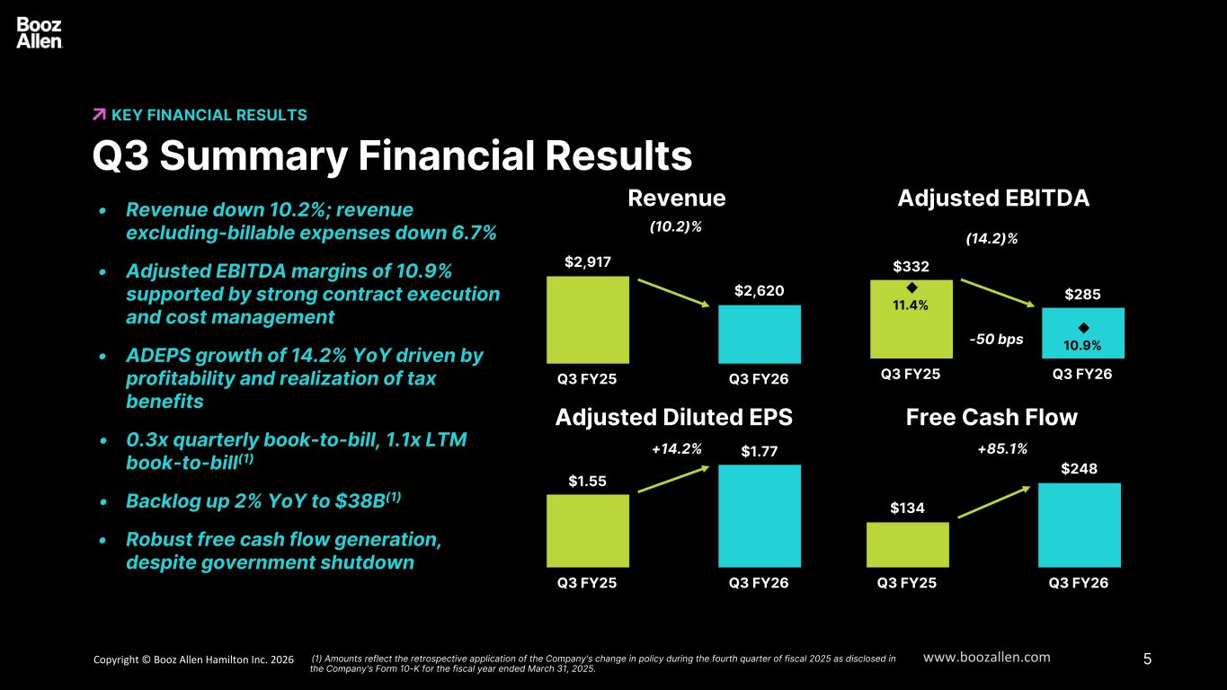 4版权©博思艾伦咨询公司2025 www.boozallen.com“博思艾伦的领先技术与国家的最高优先事项保持一致。我相信,我们正走在加速增长的轨道上,加深我们对美国安全和繁荣的影响。”— Horacio Rozanski董事长兼首席执行官6项关键成果符合修订后的指引业绩反映了强大的执行力、严格的成本管理以及动态环境中的持续转型,整个企业的需求正在加强-通过与a16z的开创性合作伙伴关系,在国家安全任务中赢得并扩大了高价值技术工作,为未来投资