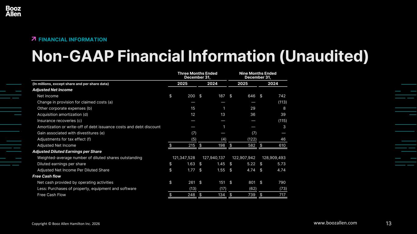 12版权所有©博思艾伦咨询公司2025 www.boozallen.com丨博思艾伦汉密尔顿博思艾伦咨询限制性非公认会计准则财务信息(未经审计)财务信息6截至12月31日止三个月、截至12月31日止九个月(单位:百万,除股份和每股数据)2025202420252024收入,不包括可结算费用收入2,620美元2,917美元8,434美元9,005减:可结算费用7749392,5732,852收入,不包括可结算费用*1,846美元1,978美元5,861美元6,153美元EBITDA,调整后EBITDA,和调整后EBITDA利润率净收入$ 200 $ 187 $ 646 $ 742所得税(福利)费用(13)61(10)233利息费用,净收入和其他收入(费用)4343134120折旧和摊销4040121123 EBITDA 270美元331美元891美元1,218索赔成本准备金变化(a)————(113)其他公司费用(b)151298保险赔偿(c)————(115)调整后EBITDA 285美元332美元920美元998净利润率7.6% 6.4% 7.7% 8.2%调整后EBITDA收入利润率10.9% 11.4% 10.9% 11.1%*收入,不包括可结算费用,包括截至2024年12月31日止九个月的1.13亿美元收入,这是由于我们对索赔成本的拨备减少,如下所述。由于2025财年将四舍五入列报方式更改为百万,因此对此列报方式中的比较期间列报方式进行了相应调整。