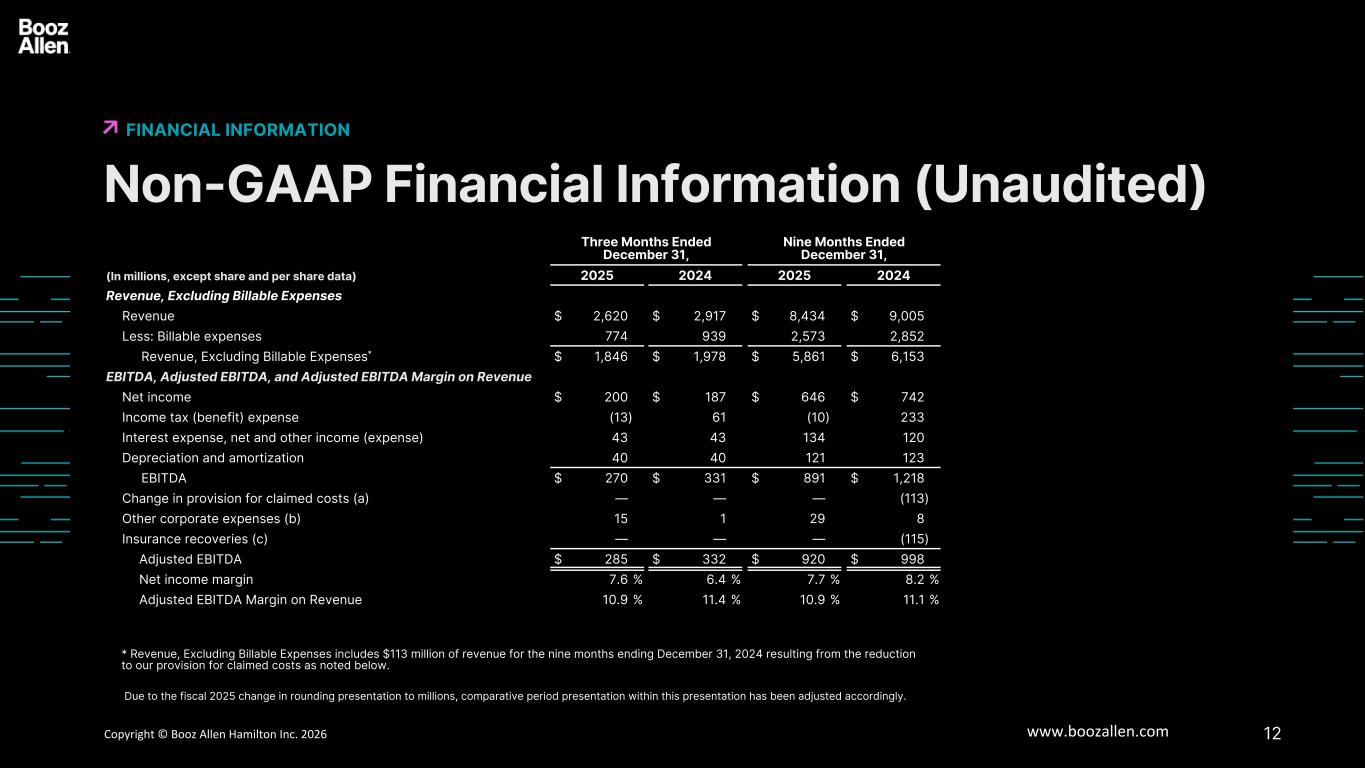 11版权所有©博思艾伦咨询 Inc. 2025 www.boozallen.com 博思艾伦咨询受限非公认会计准则财务信息免责声明6 •“收入,不包括可结算费用”指收入减去可结算费用。博思艾伦使用收入,不包括可结算费用,因为它通过排除分包商费用、差旅费用以及为履行合同而产生的其他非人工费用等成本的影响,为管理层提供了有关公司经营业绩的有用信息。可结算费用通常利润率较低,因此对我们的利润产生能力的指示作用较小。•“EBITDA”是指扣除所得税、利息支出、净收入和其他收入(支出)以及折旧和摊销前的净收入。•“调整后EBITDA”是指扣除所得税费用(收益)、利息费用、净额和其他收入(费用)、折旧和摊销以及某些其他项目之前的净收入,包括历史费率年度索赔成本拨备的变化、某些其他公司费用、DC税收评估调整和某些保险赔偿。“调整后EBITDA收入利润率”的计算方法为调整后EBITDA除以收入。博思艾伦编制调整后EBITDA和调整后EBITDA利润率对收入的影响,以消除由于其固有的不寻常、特殊或非经常性性质或由于它们是由类似性质的事件导致而被认为不能表明持续经营业绩的项目的影响。•“调整后净收入”指以下情况之前的净收入:(i)历史费率年度索赔成本拨备的变化(ii)某些其他公司费用,(iii)收购摊销,(iv)某些保险追偿,(v)与资产剥离相关的收益,以及(vi)债务发行成本和债务折扣的摊销或注销,在每种情况下均扣除适当情况下使用假定有效税率计算的税收影响。博思艾伦编制调整后的净收入以消除项目的影响,扣除税后,它不认为由于其固有的不寻常、非凡或非经常性性质或因为它们是由类似性质的事件导致的持续经营业绩的指示性。•“调整后稀释每股收益”是指使用调整后净收入而不是净收入计算的稀释每股收益。此外,根据公司截至2025年3月31日的财政年度的10-K表格合并财务报表脚注中披露的两类法的要求,调整后的稀释每股收益不考虑对净收入进行任何调整。•“自由现金流”指经营活动产生的现金净额减去购买物业、设备和软件的影响。•“调整后有效税率”表示不包括净收入调整的所得税影响的所得税费用(收益),除以调整后的所得税费用前利润•“净杠杆率”的计算方法是净债务(总债务减去现金)除以前十二个月的调整后EBITDA。