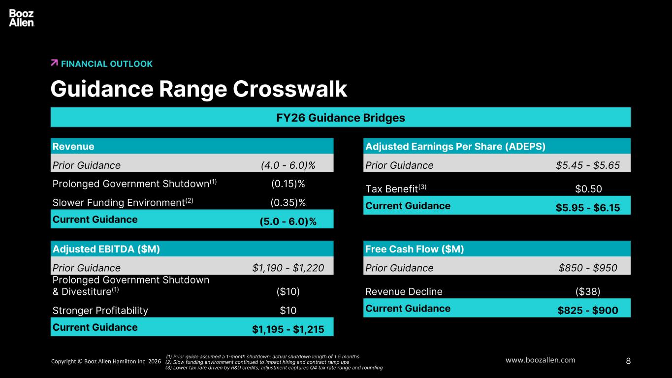 7版权©博思艾伦咨询公司2025年www.boozallen.com财务展望更新的2026财年指导意见6假设•调整后的有效税率:16-19% •平均稀释后的股份数量:1.22亿-1.23亿股对账因依赖S-K条例第10(e)(1)(i)(b)项而被省略。见“非公认会计原则财务信息”。更新的2026财年指引先前的2026财年指引收入$ 11.3-$ 114亿$ 11.3-$ 115亿收入增长(5.0-6.0)%(4.0-6.0)%调整后EBITDA $ 1,195-$ 12.15亿$ 1,190-$ 12.20亿收入调整后EBITDA利润率mid 10% mid 10% adjusted diluted EPS $ 5.95-$ 6.15 $ 5.45-$ 5.65自由现金流$ 825-$ 9亿$ 8.50-9.5亿美元•资本支出:1亿美元• 2.35亿美元相对于初始指引的现金税收优惠,这是由于One Big Beautiful Bill下的新S174规则