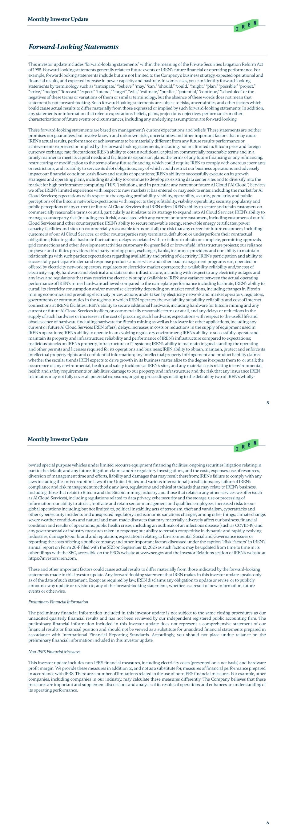 每月投资者更新5项前瞻性陈述本次投资者更新包括1995年《私人证券诉讼改革法案》含义内的“前瞻性陈述”。前瞻性陈述通常与未来事件或IREN未来的财务或经营业绩有关。例如,前瞻性陈述包括但不限于公司的业务战略、预期的运营和财务结果,以及预期的电力容量和哈希率的增加。在某些情况下,您可以通过“预期”、“相信”、“可能”、“可以”、“应该”、“可以”、“可能”、“可能”、“计划”、“可能”、“项目”、“努力”、“预算”、“预测”、“预期”、“打算”、“目标”、“将”、“估计”、“预测”、“潜在”、“继续”、“计划”或这些术语的否定或它们的变体或类似术语来识别前瞻性陈述,但没有这些词语并不意味着该陈述不具有前瞻性。此类前瞻性陈述受到风险、不确定性和其他因素的影响,这些因素可能导致实际结果与此类前瞻性陈述明示或暗示的结果存在重大差异。此外,任何涉及预期、信念、计划、预测、目标、绩效或未来事件或情况的其他特征的陈述或信息,包括任何基本假设,都是前瞻性的。这些前瞻性陈述是基于管理层当前的预期和信念。这些陈述既不是承诺也不是保证,而是涉及已知和未知的风险、不确定性和其他可能导致IREN的实际结果、业绩或成就与前瞻性陈述中明示或暗示的任何未来结果业绩或成就存在重大差异的重要因素,包括但不限于:比特币价格和外币汇率波动;IREN以商业上合理的条款及时获得额外资本以满足其资本需求并促进其扩张计划的能力;任何未来融资或任何再融资的条款,重组或修改任何未来融资的条款,这可能要求IREN遵守繁重的契诺或限制,以及其偿还债务的能力,其中任何一项都可能限制我们的业务运营并对我们的财务状况、现金流和经营业绩产生不利影响;IREN成功执行其增长战略和经营计划的能力,包括其继续开发其现有数据中心站点以及向高性能计算(“HPC”)解决方案市场多元化发展的能力,尤其是我们提供的任何当前或未来的AI云(“AI云”)服务;IREN对于其已经进入或可能寻求进入的新市场(包括AI云服务市场)的有限经验;对比特币网络的持续盈利能力、可行性、可操作性、安全性、受欢迎程度和公众看法的预期;对于TERMN提供的任何当前或未来AI云服务的盈利能力、可行性、可操作性、安全性、受欢迎程度和公众看法的预期;丨IREN以商业上合理的条款或根本没有保护和留住客户的能力,特别是与其扩展到AI云服务的战略相关的战略;IREN管理与任何当前或未来客户(包括我们的AI云服务的客户和其他交易对手)相关的交易对手风险(包括信用风险)的能力;IREN以商业上合理的条款或根本没有获得可再生能源、可再生能源证书、电力容量、设施和场地的能力;任何当前或未来客户(包括我们的AI云服务的客户)或其他交易对手可能终止、违约或不履行合同义务的风险;比特币全球哈希率波动;与以下相关的延迟,或未能获得或完成、允许批准、电网连接和其他绿地或棕地基础设施项目惯常的开发活动;我们对电力和公用事业提供商、第三方矿池、交易所、银行、保险提供商的依赖以及我们与这些方保持关系的能力;对电力可用性和定价的预期;IREN的参与和成功参与需求响应产品和服务以及由电力网络运营商、监管机构或电力市场运营商运行、运营或提供的其他负荷管理计划的能力;电力供应、硬件、电气和数据中心基础设施的可用性、可靠性和/或成本, 包括关于可能限制IREN可用电力供应的任何停电和任何法律法规;IREN矿工硬件实现的实际运营性能与包括哈希率在内的铭牌性能之间的任何差异;TERM1取决于市场条件(包括比特币挖矿经济性和现行电价的变化)来减少其电力消耗和/或将电力货币化的能力;IREN运营所在地区的电力网络和市场运营商、监管机构、政府或社区采取的行动;可用性、适当性,IREN设施中互联网连接的可靠性和成本;IREN以商业上合理的条款或根本没有保护额外硬件的能力,包括用于比特币挖矿的硬件及其提供的任何当前或未来的AI云服务,以及此类硬件供应的任何延迟或减少或采购此类硬件的成本增加;对硬件(包括用于比特币挖矿的硬件以及用于其他应用的硬件,包括当前或未来的AI云服务IREN提供的任何硬件)的使用寿命和过时情况的预期;延迟,IREN运营中使用的设备的成本增加或供应减少;IREN在不断变化的监管环境中运营的能力;IREN基础设施成功运营和维护其财产和基础设施的能力;TERM3基础设施的可靠性和性能与预期相比;对IREN的财产、基础设施或IT系统的恶意攻击;TERMN保持其运营和业务所需的运营和其他许可和执照的良好信誉的能力;IREN获得、维护、保护和执行其知识产权和机密信息;任何知识产权侵权和产品责任索赔;IREN预计将推动其业务增长的长期趋势是否达到了其预期的程度,或者根本没有实现;IREN现场发生的任何环境、健康和安全事件,以及与环境相关的任何材料成本,健康和安全要求或责任;对我们的财产和基础设施造成的损害,以及IREN维持的任何保险可能无法完全涵盖所有潜在风险的风险;正在进行的与两个IREN's full-monthly Investor Update 6在有限追索权设备融资便利下拥有的特殊目的载体的违约有关的诉讼;正在进行的与部分违约有关的证券诉讼;以及未来的任何诉讼、索赔和/或监管调查,以及成本、费用、资源使用、管理时间和精