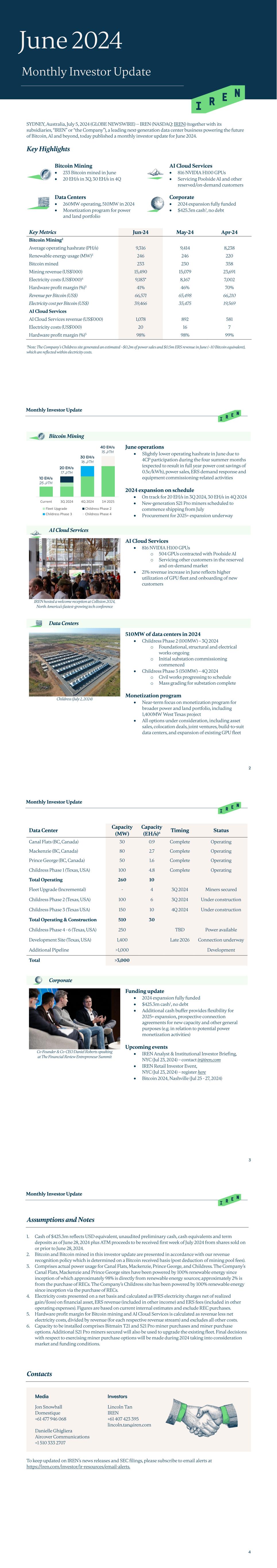 澳大利亚悉尼2024年7月5日电(GLOBE NEWSWIRE)--为比特币、人工智能及其他领域的未来提供动力的领先下一代数据中心企业IREN(纳斯达克股票代码:IREN)(连同其子公司,“IREN”或“本公司”)今天发布了2024年6月的月度投资者更新报告。主要亮点比特币挖矿AI云服务• 6月份开采了233个比特币•第三季度20 EH/s,第四季度30 EH/s • 816个NVIDIA H100 GPU •为池畔AI和其他保留/按需客户数据中心提供服务企业• 260MW运营,2024年510MW •电力和土地组合的货币化计划• 2024年扩建资金充足• 4.253亿美元现金1,无债务关键指标Jun-24 May-24 Apr-24比特币挖矿2平均运营算力(PH/s)9,3169,4148,238可再生能源使用量(MW)3246246220比特币挖矿233230358挖矿收入(US $‘000)15,49015,07923,691电力成本(US $’000)49,183 * 8,1677,002硬件利润率(%)541% 46% 70%每比特币收入(美元)66,57165,49866,210每比特币电力成本(美元)39,46635,47519,569 AI云服务AI云服务收入(美元‘000)1,078892581电力成本(美元’000)20167硬件利润率(%)598% 98% 99% *注:公司Childress站点产生的估计~以及6月份50万美元的ERS收入(约10个比特币等值),这反映在电力成本中。2024年6月月度投资者更新月度投资者更新2比特币挖矿6月运营•由于夏季四个月的4CP参与(预计将导致全年电力成本节省0.5c/kWh)、电力销售、ERS需求响应和设备调试相关活动,6月份运营算力略有下降2024年如期扩容•有望在2024年第三季度实现20 EH/s,在2024年第四季度实现30 EH/s •新一代S21 Pro矿机计划从7月开始发货• 2025年采购+扩展正在进行中AI云服务IREN在Collision 2024举办了欢迎招待会,北美增长最快的技术会议AI云服务• 816个NVIDIA H100 GPU或504个与Poolside AI签约的GPU o为预订和按需市场的其他客户提供服务• 6月收入增长21%,反映出GPU车队利用率提高和新客户入职数据中心Childress(2024年7月2日)2024年数据中心510MW • Childress Phase 2(100MW)– 2024年第三季度o基础,结构和电气工程正在进行中o初步变电站调试开始• Childress第三阶段(150MW)– 2024年第四季度o土建工程进展到时间表o变电站的大规模分级完成货币化计划•近期重点关注更广泛的电力和土地组合的货币化计划,包括1,400MW的西德克萨斯项目•正在考虑的所有选项,包括资产出售、托管交易、合资企业、定制数据中心,现有GPU车队当前Q3 2024 Q4 2024 1H2025车队升级Childress Phase 2 Childress Phase 3 Childress Phase 4 30EH/s 16 J/TH 40 EH/s 15 J/TH 10 EH/s 25 J/TH 20 EH/s 17 J/TH月度投资者更新3数据中心容量(MW)容量(EH/s)6时序状态Canal Flats(BC,Canada)300.9 Complete Operating Mackenzie(BC,Canada)802.7 Complete Operating Prince George(BC,Canada)501.6 Complete Operating Childress Phase 1(Texas,美国)1004.8完整运营总数运营26010车队升级(增量)-4 2024年第三季度矿工获得Childress Phase 2(美国德克萨斯州)1006 2024年第三季度在建Childress Phase 3(美国德克萨斯州)15010 2024年第四季度在建总运营和建设51030 Childress Phase 4-6(美国德克萨斯州)250 TBD电力可用开发场地(美国德克萨斯州)1,400 2026年末连接正在进行额外管道> 1,000开发总数> 3,000企业联合创始人兼联合首席执行官Daniel Roberts在金融评论企业家峰会上发言资金更新• 2024年扩建资金充足• 4.253亿美元现金1,没有债务•额外的现金缓冲为2025 +扩建、新产能的潜在连接协议和其他一般用途(例如与潜在的电力货币化活动有关)提供灵活性即将发生的事件• IREN分析师和机构投资者简报,纽约(2024年7月23日)– contact ir@iren.com • IREN散户投资者活动,纽约(2024年7月23日)–在此处注册•比特币2024,纳什维尔(2024年7月25日-27日)每月投资者更新4个假设和说明1。4.253亿美元的现金反映了截至2024年6月28日的等值美元、未经审计的初步现金、现金等价物和定期存款,以及将于2024年7月第一周从2024年6月28日或之前出售的股票中获得的ATM收益。2.本次投资者更新中挖掘的比特币和比特币是根据我们的收入确认政策呈现的,该政策是在比特币收到的基础上确定的(扣除矿池费用后)。3.包括Canal Flats、Mackenzie、Prince George和Childress的实际电力使用情况。该公司的运河平层, 自成立以来,麦肯齐和乔治王子站一直使用100%可再生能源供电,其中约98%直接来自可再生能源;约2%来自购买REC。该公司的Childress站点自成立以来一直通过购买REC使用100%可再生能源供电。4.电力成本按净额列报,计算方式为IFRS电费,扣除金融资产已实现收益/(损失)、ERS收入(计入其他收入)和ERS费用(计入其他经营费用)。数据基于当前的内部估计,不包括REC采购。5.比特币挖矿和AI云服务的硬件利润率计算为收入减去净电力成本,除以收入(针对每个相应的收入流),并不包括所有其他成本。6.将安装的容量包括比特大陆T21和S21 Pro矿机购买和矿机购买选项。获得保障的额外S21 Pro矿工也将用于升级现有车队。关于行使矿商购买选择权的最终决定将在2024年期间做出,同时考虑到市场和资金状况。联系人媒体Jon Snowball Domestique + 61477946068 Danielle Ghigliera Aircover Communications + 15103332707 Investors Lincoln Tan IREN + 61407423395 lincoln.tan@iren.com要随时了解IREN新闻稿和SEC文件的最新信息,请通过https://iren.com/investor/ir-resources/email-alerts订阅电子邮件提醒。