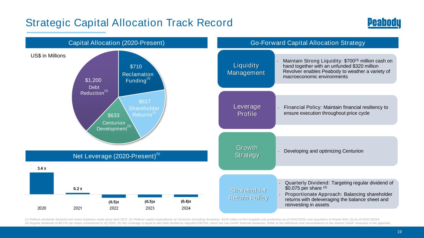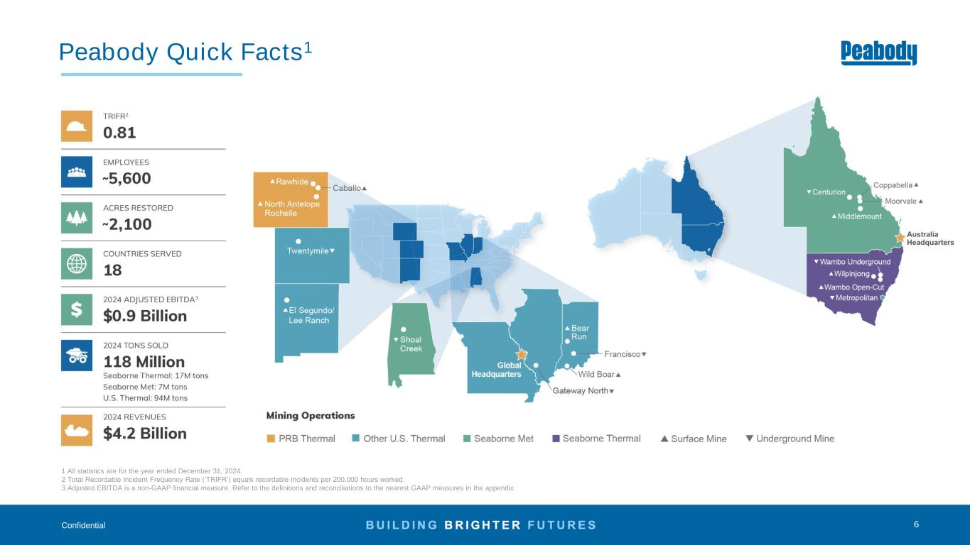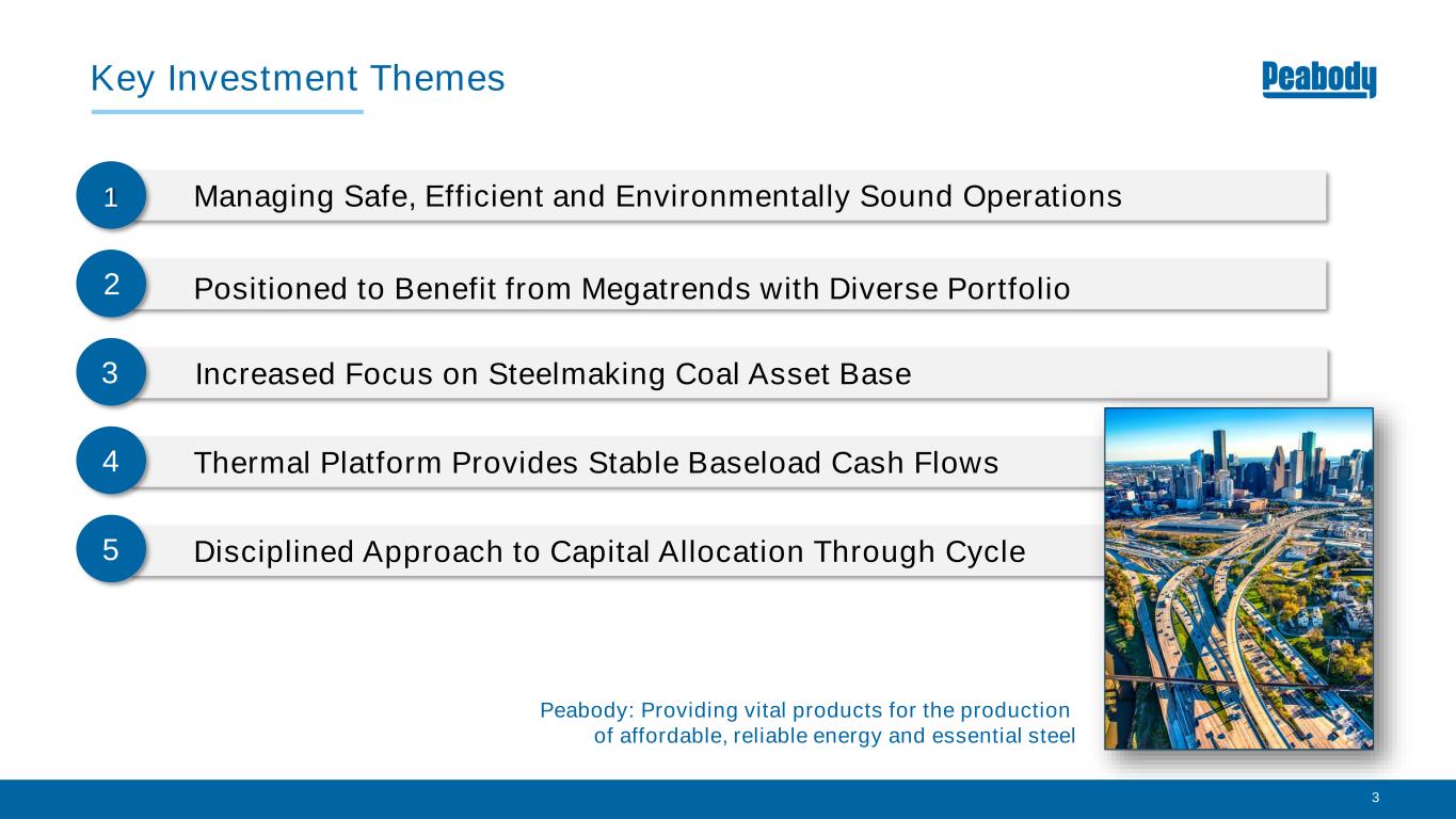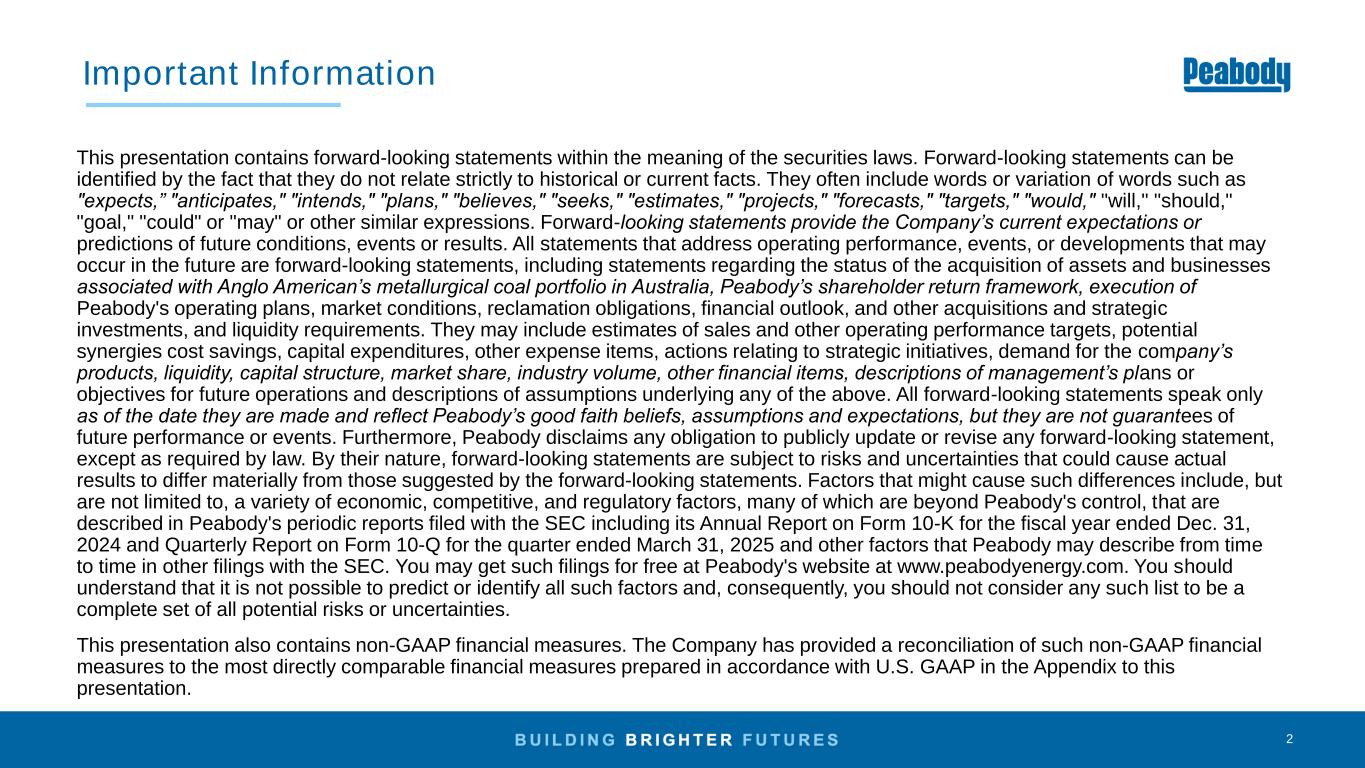 2重要信息本演示文稿包含证券法含义内的前瞻性陈述。前瞻性陈述可以通过以下事实来识别:它们与历史或当前事实并不严格相关。它们通常包括诸如“预期”、“预期”、“打算”、“计划”、“相信”、“寻求”、“估计”、“项目”、“预测”、“目标”、“将”、“将”、“应该”、“目标”、“可能”或其他类似表述等词语或变体。前瞻性陈述提供了公司当前对未来状况、事件或结果的预期或预测。所有涉及未来可能发生的经营业绩、事件或发展的陈述均为前瞻性陈述,包括关于收购与英美资源集团在澳大利亚的冶金煤投资组合相关的资产和业务的状态、皮博迪的股东回报框架、皮博迪运营计划的执行情况、市场状况、回收义务、财务前景以及其他收购和战略投资以及流动性要求的陈述。它们可能包括对销售和其他经营业绩目标的估计、潜在的协同效应成本节约、资本支出、其他费用项目、与战略举措相关的行动、对公司产品的需求、流动性、资本结构、市场份额、行业数量、其他财务项目、管理层对未来经营的计划或目标的描述以及对上述任何假设的描述。所有前瞻性陈述仅在作出之日发表,反映了皮博迪的善意信念、假设和预期,但它们不是对未来业绩或事件的保证。此外,除法律要求外,皮博迪不承担任何公开更新或修改任何前瞻性陈述的义务。就其性质而言,前瞻性陈述受到风险和不确定性的影响,这些风险和不确定性可能导致实际结果与前瞻性陈述所暗示的结果存在重大差异。可能导致这种差异的因素包括但不限于各种经济、竞争和监管因素,其中许多因素超出了皮博迪的控制范围,这些因素在皮博迪提交给SEC的定期报告中有所描述,包括其截至2024年12月31日的财政年度的10-K表格年度报告和截至2025年3月31日的季度的10-Q表格季度报告,以及皮博迪可能不时在提交给SEC的其他文件中描述的其他因素。您可以在皮博迪的网站www.peabodyenergy.com上免费获得此类文件。您应该了解,不可能预测或识别所有这些因素,因此,您不应该将任何此类清单视为所有潜在风险或不确定性的完整集合。本演示文稿还包含非GAAP财务指标。公司在本演示文稿的附录中提供了此类非公认会计原则财务指标与根据美国公认会计原则编制的最直接可比财务指标的对账。