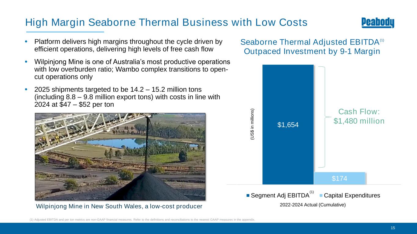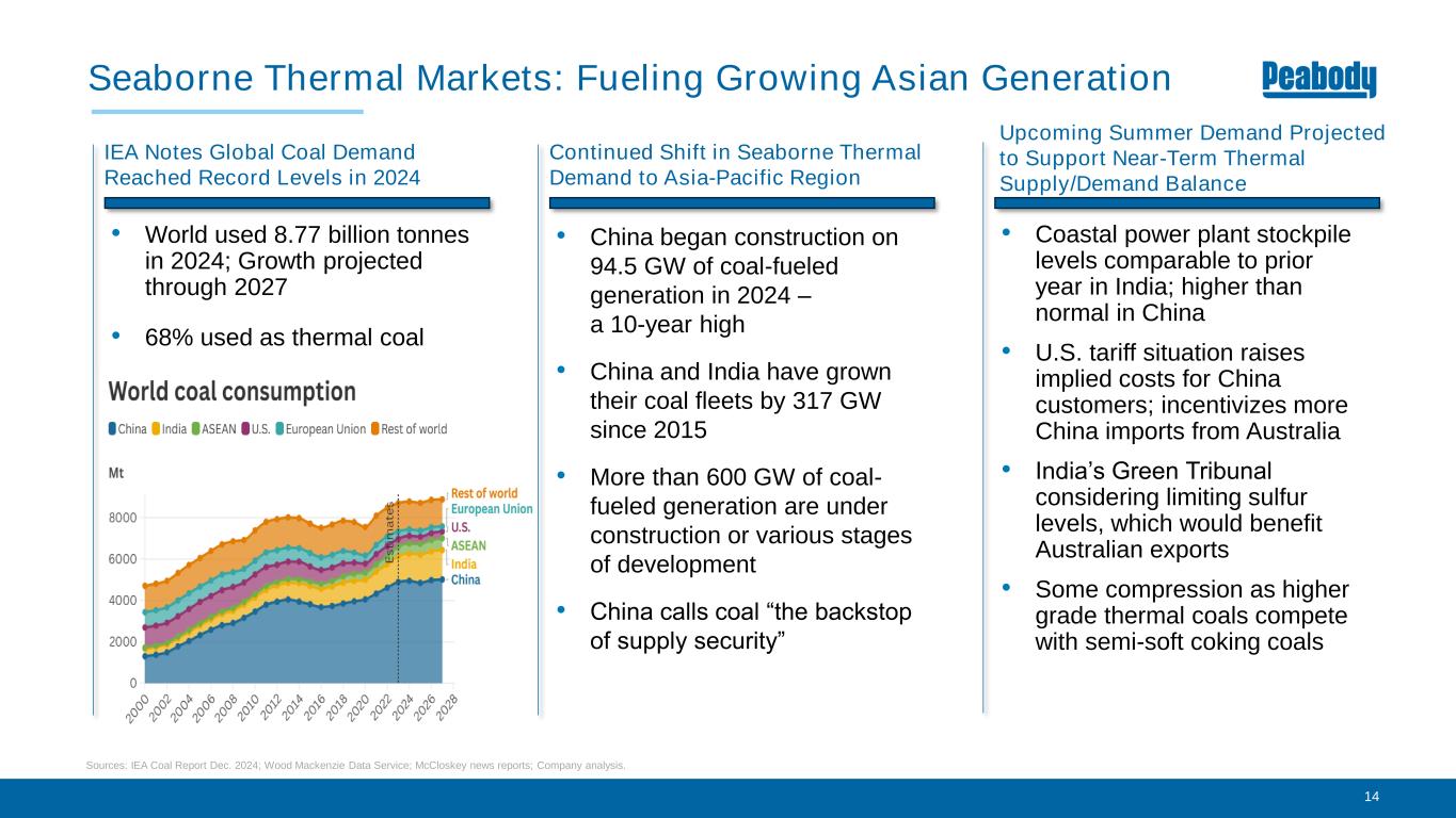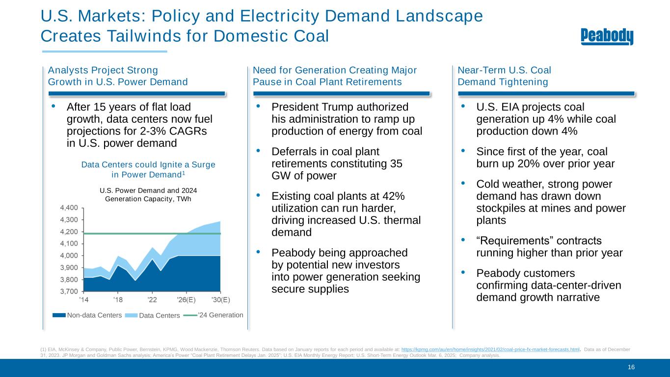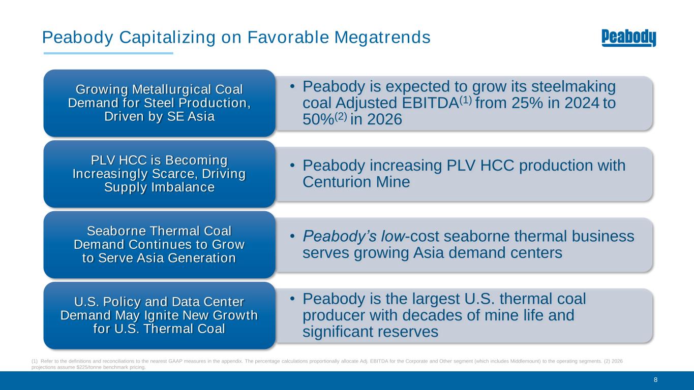 2重要信息本演示文稿包含证券法含义内的前瞻性陈述。前瞻性陈述可以通过以下事实来识别:它们与历史或当前事实并不严格相关。它们通常包括诸如“预期”、“预期”、“打算”、“计划”、“相信”、“寻求”、“估计”、“项目”、“预测”、“目标”、“将”、“将”、“应该”、“目标”、“可能”或其他类似表述等词语或变体。前瞻性陈述提供了公司当前对未来状况、事件或结果的预期或预测。所有涉及未来可能发生的经营业绩、事件或发展的陈述均为前瞻性陈述,包括关于收购与英美资源集团在澳大利亚的冶金煤投资组合相关的资产和业务的状态、皮博迪的股东回报框架、皮博迪运营计划的执行情况、市场状况、回收义务、财务前景以及其他收购和战略投资以及流动性要求的陈述。它们可能包括对销售和其他经营业绩目标的估计、潜在的协同效应成本节约、资本支出、其他费用项目、与战略举措相关的行动、对公司产品的需求、流动性、资本结构、市场份额、行业数量、其他财务项目、管理层对未来经营的计划或目标的描述以及对上述任何假设的描述。所有前瞻性陈述仅在作出之日发表,反映了皮博迪的善意信念、假设和预期,但它们不是对未来业绩或事件的保证。此外,除法律要求外,皮博迪不承担任何公开更新或修改任何前瞻性陈述的义务。就其性质而言,前瞻性陈述受到风险和不确定性的影响,这些风险和不确定性可能导致实际结果与前瞻性陈述所暗示的结果存在重大差异。可能导致这种差异的因素包括但不限于各种经济、竞争和监管因素,其中许多因素超出了皮博迪的控制范围,这些因素在皮博迪提交给SEC的定期报告中有所描述,包括其截至2024年12月31日的财政年度的10-K表格年度报告和截至2025年3月31日的季度的10-Q表格季度报告,以及皮博迪可能不时在提交给SEC的其他文件中描述的其他因素。您可以在皮博迪的网站www.peabodyenergy.com上免费获得此类文件。您应该了解,不可能预测或识别所有这些因素,因此,您不应该将任何此类清单视为所有潜在风险或不确定性的完整集合。本演示文稿还包含非GAAP财务指标。公司在本演示文稿的附录中提供了此类非公认会计原则财务指标与根据美国公认会计原则编制的最直接可比财务指标的对账。