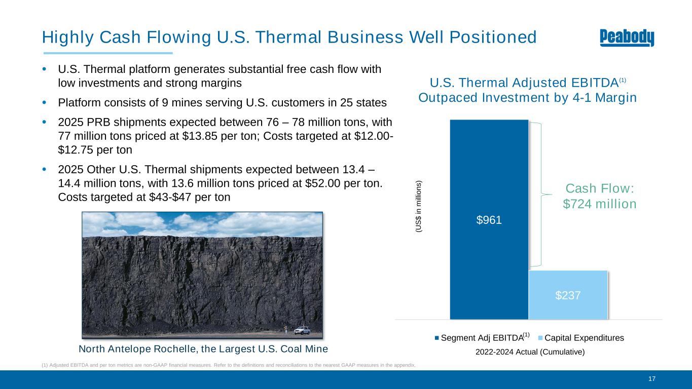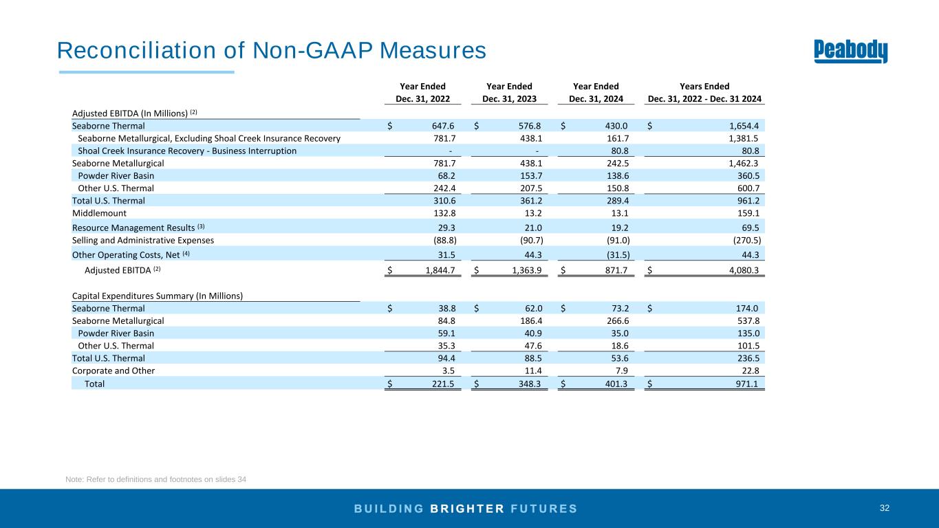 32非公认会计原则措施的调节注:请参阅幻灯片上的定义和脚注34年终年度截至2022年12月31日2023年12月31日2024年12月31日2022年12月31日至2024年12月31日调整后EBITDA(百万)(2)Seaborne Thermal $ 647.6 $ 576.8 $ 430.0 $ 1,654.4 Seaborne Metallurgical,不包括Shoal Creek Insurance Recovery 781.74 38.11 61.71,381.5 Shoal Creek Insurance Recovery-Business Interruption--80.88 0.8 Seaborne Metallurgical 781.74 38.12 42.51,462.3 Powder River Basin 68.21 53.71 38.63 60.5 Other U.S. Thermal 242.4207.5 150.8 600.7 Total U.S. Thermal 310.6361.2289.4961.2 Middlemount 13 2.81 3.21 3.11 59.1 Resource Management Results(3)29.32 1.0 19.26 9.5 Selling and Administrative Expenses(88.8)(90.7)(91.0)(270.5)Other operat净额(4)31.54 4.3(31.5)44.3调整后EBITDA(2)$ 1,844.7 $ 1,363.9 $ 871.7 $ 4,080.3资本支出摘要(百万)Seaborne Thermal $ 38.8 $ 62.0 $ 73.2 $ 174.0 Seaborne Metallurgical 84.8 186.42 66.65 37.8 Powder River Basin 59.14 0.93 5.01 35.0 Other U.S. Thermal 35.347.6 18.6 101.5 Total U.S. Thermal 94.488.55 3.62 36.5 Corporate and Other 3.51 1.479 22.8 total $ 221.5 $ 348.3 $ 401.3 $ 971.1