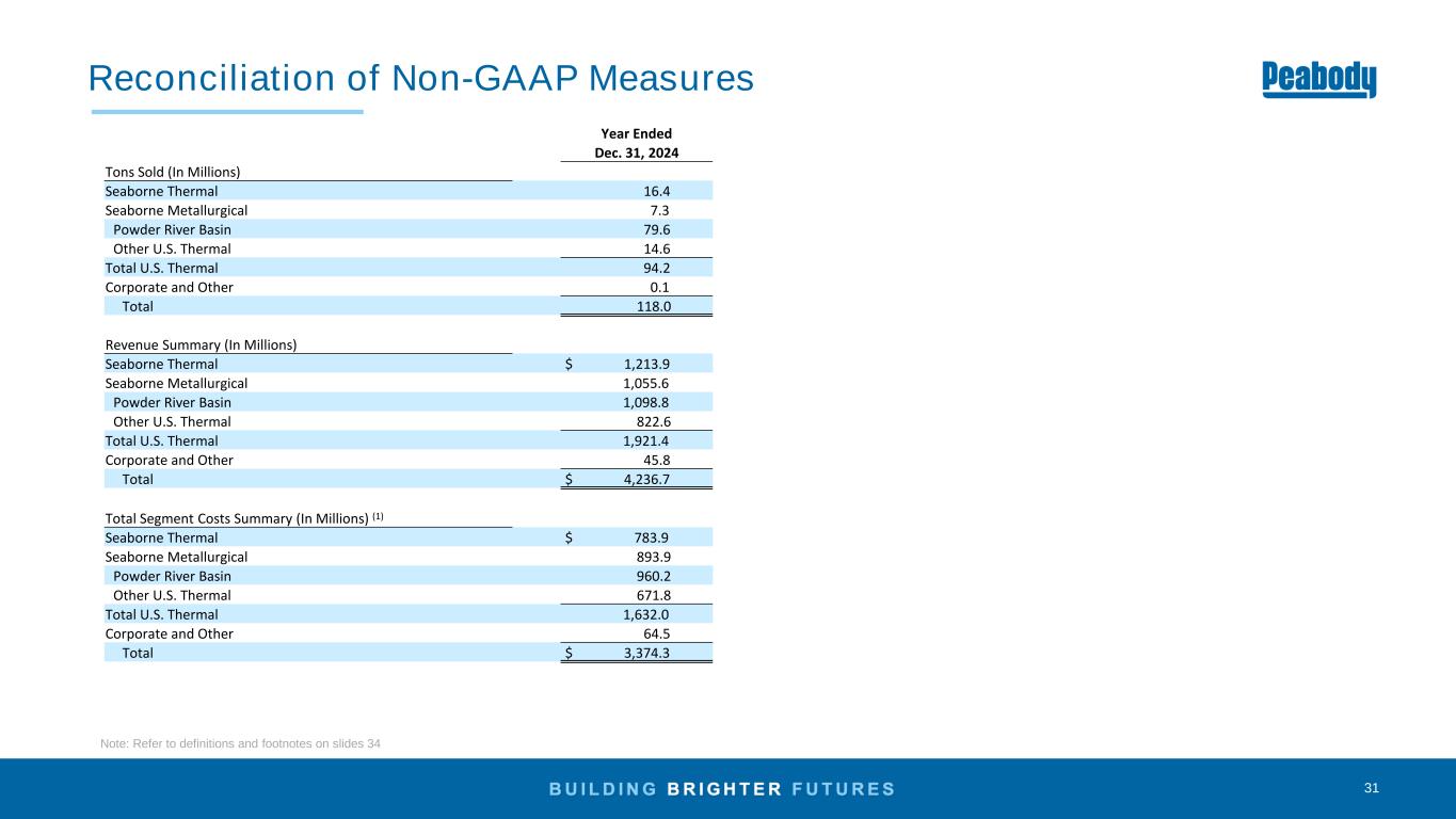 31非公认会计原则措施的调节注意:请参阅截至12月31日的34年的幻灯片上的定义和脚注,已售2024吨(百万)海运热力16.4海运冶金7.3粉河流域79.6其他美国热力14.6美国热力总量94.2企业及其他0.1合计118.0收入汇总表(百万)海运热力1,213.9美元海运冶金1,055.6粉河流域1,098.8其他美国热力822.6美国热力总量1,921.4企业及其他45.8合计4,236.7美元分部总成本汇总表(百万)(1)海运热力783.9美元海运冶金893.9粉河流域960.2其他美国热力671.8美国热力总量1,632.0企业及其他64.5合计3,374.3美元