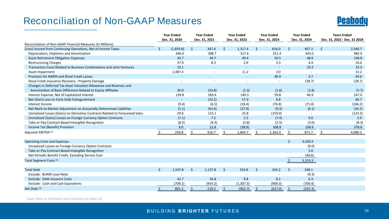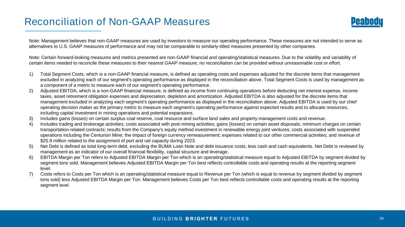 34非公认会计原则措施的调节注:管理层认为,投资者使用非公认会计原则措施来衡量我们的经营业绩。这些衡量标准无意作为美国公认会计准则业绩衡量标准的替代方案,可能无法与其他公司提出的类似名称的衡量标准进行比较。注:所提供的某些前瞻性衡量标准和指标是非GAAP财务和运营/统计衡量标准。由于将这些措施与其最接近的GAAP措施进行协调所需的某些项目的波动性和可变性,如果没有不合理的成本或努力,就无法提供任何调节。1)分部总成本是一种非公认会计准则财务指标,定义为管理层在分析我们每个分部的经营业绩时排除的离散项目调整后的运营成本和费用,如上面的对账所示。管理层使用分部总成本作为衡量我们每个分部经营业绩的指标的组成部分。2)调整后EBITDA是一种非GAAP财务指标,定义为扣除净利息费用、所得税、资产报废义务费用和折旧、损耗和摊销之前的持续经营收入。调整后的EBITDA也针对管理层在分析上述调节中显示的每个分部的经营业绩时排除的离散项目进行了调整。调整后的EBITDA被我们的首席运营决策者用作衡量每个部门的运营业绩与预期结果的主要指标,并用于分配资源,包括对采矿业务和潜在扩张的资本投资。3)包括某些剩余煤炭储备的收益(损失)、煤炭资源和地面土地销售以及物业管理成本和收入。4)包括交易和经纪活动;与采矿后活动相关的成本;某些资产处置的收益(损失);某些运输相关合同的最低收费;公司对可再生能源合资企业的权益法投资的结果;与包括Centurion矿在内的暂停运营相关的成本;外币重新计量的影响;与我们其他商业活动相关的费用;以及与2023年港口和铁路运力转让相关的收入2590万美元。5)净债务定义为长期债务总额,不包括BUMA贷款票据和债务发行成本,减去现金和现金等价物。净债务由管理层审查,作为我们整体财务灵活性、资本结构和杠杆的指标。6)每吨EBITDA利润率是指每吨调整后EBITDA利润率,这是一种经营/统计计量,等于按分部划分的调整后EBITDA除以销售的分部吨。管理层认为,调整后的每吨EBITDA利润率最能反映报告分部层面的可控成本和经营业绩。7)成本是指每吨成本,这是一种运营/统计计量,等于每吨收入(等于按分部划分的收入除以销售的分部吨)减去每吨调整后EBITDA利润率。管理层认为,每吨成本最能反映报告分部层面的可控成本和经营成果。