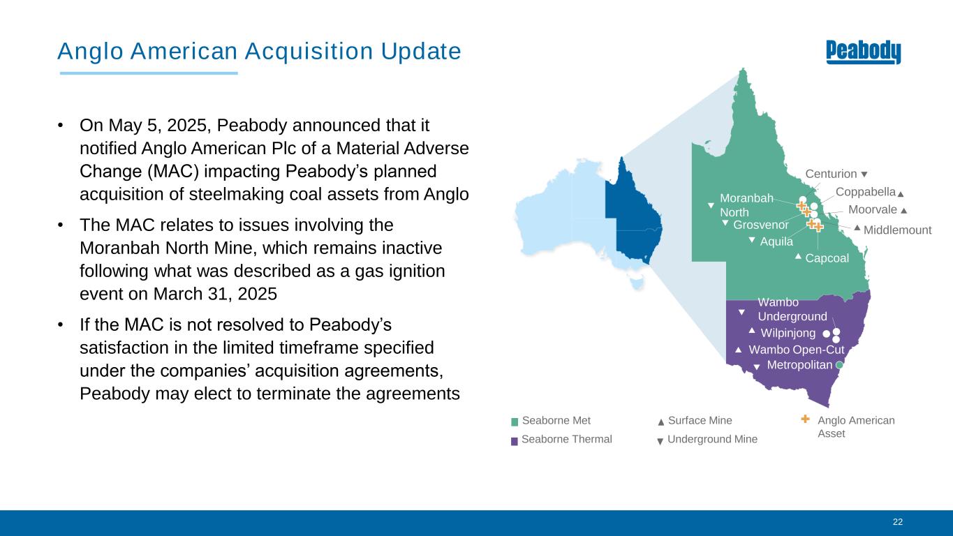 22 Moranbah North Centurion Coppabella Moorvale Middlemount Capcoal Grosvenor Aquila Wambo Underground Wilpinjong Wambo Open-Cut Metropolitan Anglo American Acquisition Update Seaborne Met Seaborne Thermal Surface Mine Underground Mine Anglo American Asset • 2025年5月5日,Peabody宣布向Anglo American Plc通报了影响Peabody计划从Anglo收购炼钢煤资产的重大不利变化(MAC)• MAC涉及Moranbah North矿的问题,该矿在3月31日被称为气体点火事件后仍处于非活动状态,2025 •如果MAC未能在两家公司收购协议规定的有限时间范围内得到皮博迪满意的解决,皮博迪可选择终止协议
