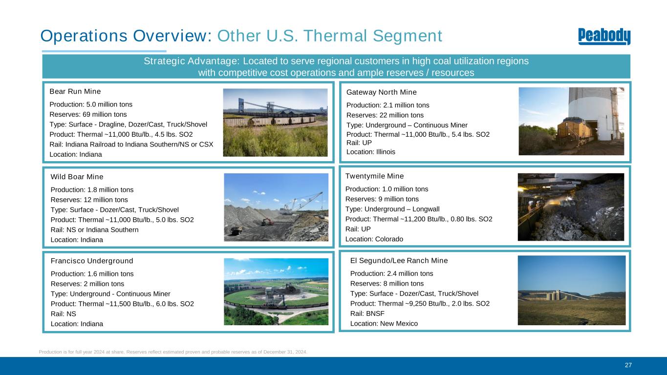 26运营概览:PRB部门的产量为2024年全年的份额。储量反映截至2024年12月31日的估计探明储量和概略储量。战略优势:低成本运营、最大生产商、储量可观、资源共享、技术北方羚羊罗谢尔矿(NARM)产量:5970万吨储量:13亿吨类型:地面-拖缆、推土机/铸件、卡车/铲子产品:分位热(~8800 BTU/磅,< 0.50磅。SO2)Rail:BNSF和UP地点:怀俄明州Caballo矿产量:1080万吨储量:1.68亿吨类型:地面-推土机/铸件,卡车/铲子产品:亚位热(~8500 BTU/磅,0.80磅。SO2)Rail:BNSF和UP地点:怀俄明州生皮矿产量:910万吨储量:8000万吨类型:地面-推土机/铸件,卡车/铲子产品:分位热(~8300 BTU/磅,0.85磅。SO2)Rail:BNSF地点:怀俄明州