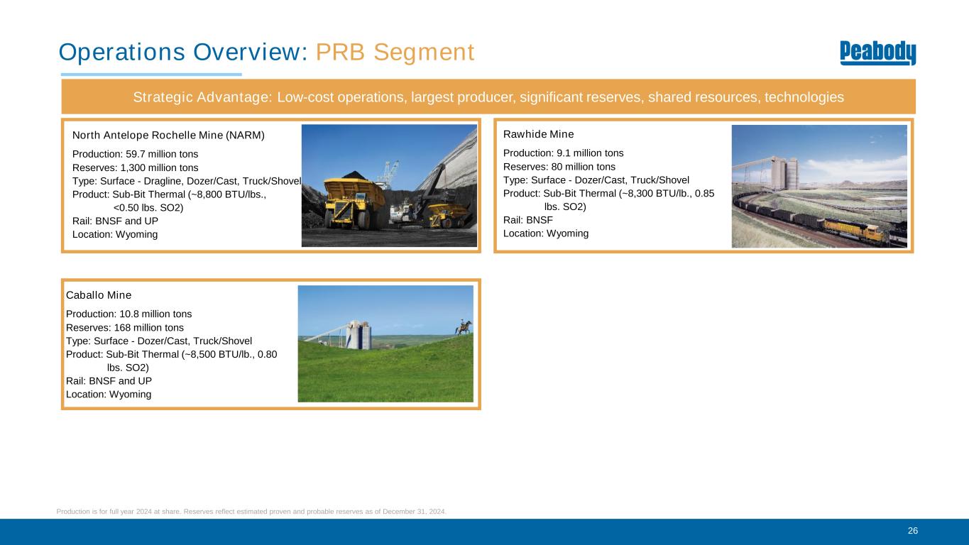25运营概览:海运热力部分的生产按份额计算为2024年全年。储量反映截至2024年12月31日的估计探明储量和概略储量。战略优势:定位于服务亚太市场的高利润率运营Wilpinjong矿产量:1260万吨(出口和国内)储量:4600万吨类型:地面-推土机/铸件,卡车/铲子产品:出口(5,000-6,000千卡/公斤NAR)港口:纽卡斯尔煤炭基础设施集团(NCIG)和Port Waratah煤炭服务(PWCS)地点:澳大利亚新南威尔士Wambo露天产量:330万吨储量:2900万吨类型:地面-卡车/铲子产品:优质出口(~6000千卡/公斤NAR)港口:NCIG和PWCS地点:新南威尔士,澳大利亚Wambo地下产量:140万吨储量:100万吨类型:地下-长壁产品:优质出口(~6000千卡/千克NAR)港口:NCIG和PWCS位置:澳大利亚新南威尔士