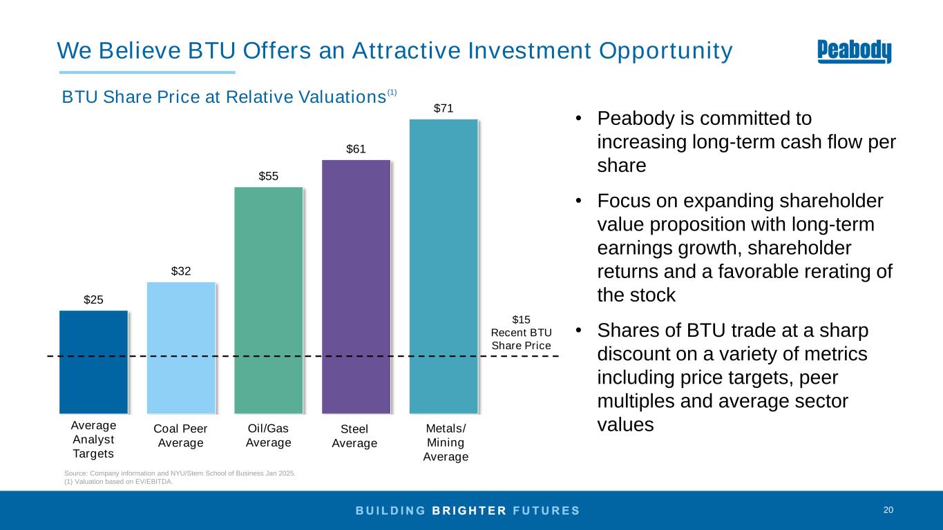 20我们认为BTU提供了一个有吸引力的投资机会• Peabody致力于增加每股长期现金流•专注于扩大股东价值主张,实现长期盈利增长、股东回报和对股票的有利重评•在包括价格目标、同行倍数和平均行业价值在内的各种指标上,BTU的股票交易价格大幅折价$ 25 $ 32 $ 55 $ 61 $ 71 BTU股价按相对估值(1)$ 15最近的BTU股价来源:公司信息和纽约大学/斯特恩商学院2025年1月。(1)基于EV/EBITDA的估值。平均分析师目标煤炭同行平均石油/天然气平均钢铁平均金属/采矿平均
