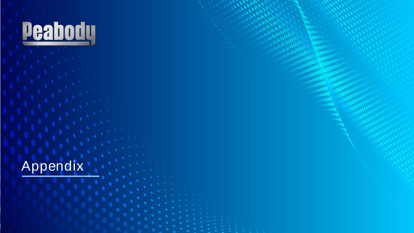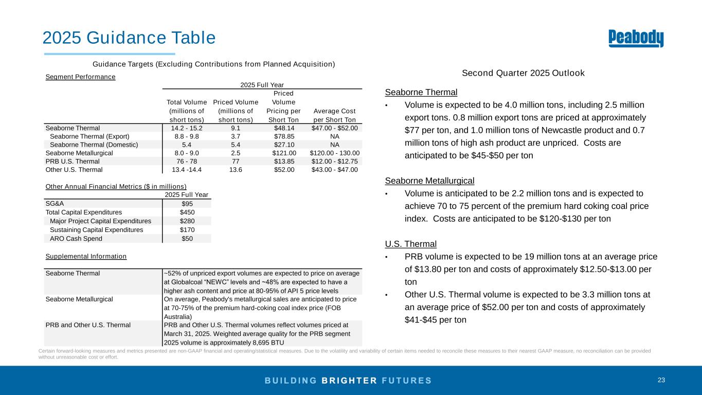232025年指导表提供的某些前瞻性措施和指标是非公认会计准则财务和运营/统计措施。由于将这些衡量标准与其最接近的GAAP衡量标准进行核对所需的某些项目的波动性和可变性,如果没有不合理的成本或努力,就无法提供任何对账。指导目标(不包括计划收购的贡献)2025年第二季度展望海运热•量预计为400万吨,其中出口250万吨。0.8百万出口吨售价约为每吨77美元,1.0百万吨纽卡斯尔产品和0.7百万吨高灰产品未定价。成本预计为每吨45-50美元Seaborne Metallurgical •量预计为220万吨,预计将实现溢价硬焦煤价格指数的70%至75%。成本预计为每吨120-130美元美国热能• PRB量预计为1900万吨,平均价格为每吨13.80美元,成本约为每吨12.50-13.00美元•美国其他热能预计为330万吨,平均价格为每吨52.00美元成本约为每吨41-45美元分部业绩2025年全年总量(百万短吨)定价数量(百万短吨)定价数量定价每短吨平均每短吨成本Seaborne Thermal 14.2-15.2 9.1 $ 48.14 $ 47.00-$ 52.00 Seaborne Thermal(Export)8.8-9.8 3.7 $ 78.85 NA Seaborne Thermal(Domestic)5.45.4 $ 27.10 NA Seaborne Metallurgical 8.0-9.0 2.5 $ 121.00 $ 120.00-130.00 PRB U.S. Thermal 76-7877 $ 13.85 $ 12.00-$ 12.75其他美国热力13.4-14.4 13.6 $ 52.00 $ 43.00-$ 47.00其他年度财务指标(百万美元)2025全年SG & A95美元总资本支出450美元主要项目资本支出280美元维持资本支出170美元ARO现金支出50美元补充信息海运热力~52%的未定价出口量预计平均定价为GlobalCoal“NEWC”水平,~48%预计灰分更高,价格为API 5价格水平的80-95 % Seaborne Metallurgical平均而言,Peabody的冶金销售预计定价为优质硬焦煤指数价格(澳大利亚离岸价)PRB和其他美国热力PRB和其他美国热力销量的70-75 %,2025.PRB分部2025年货量的加权平均质量约为8,695 BTU