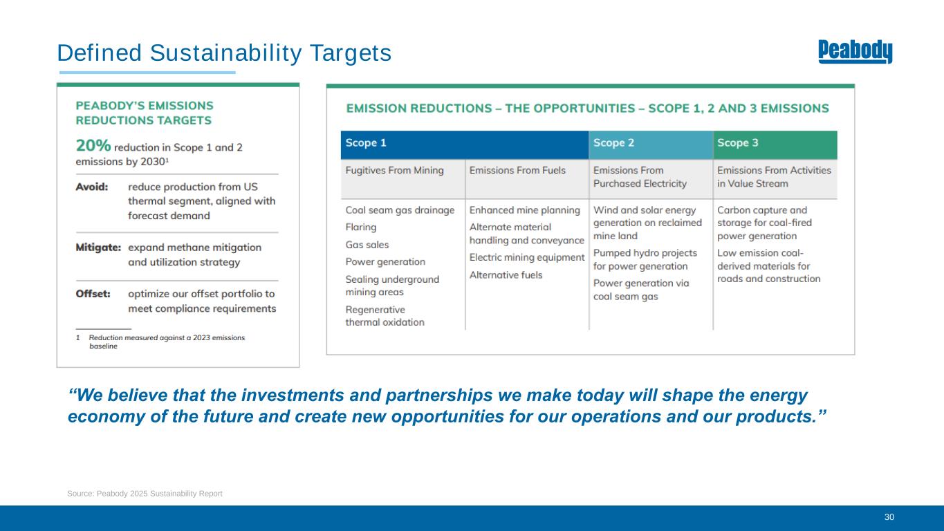 30个明确的可持续发展目标“我们相信,我们今天所做的投资和伙伴关系将塑造未来的能源经济,并为我们的运营和我们的产品创造新的机会。”资料来源:Peabody 2025可持续发展报告