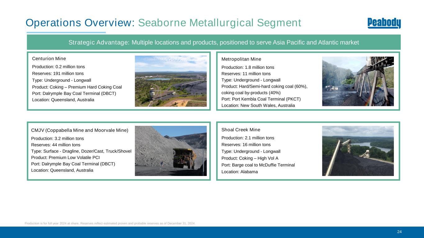 24运营概览:海运冶金部门的产量为2024年全年的份额。储量反映截至2024年12月31日的估计探明储量和概略储量。战略优势:多地多产品,定位服务亚太及大西洋市场大城市矿产量:180万吨储量:1100万吨类型:地下-长壁产品:硬/半硬焦煤(60%),焦煤副产品(40%)港口:Kembla港煤炭码头(PKCT)位置:澳大利亚新南威尔士Shoal Creek矿产量:210万吨储量:1600万吨类型:地下-长壁产品:焦化– High Vol A港口:驳船煤炭到McDuffie码头位置:Alabama CMJV(Coppabella矿和Moorvale矿)产量:320万吨储量:4400万吨类型:地表-拖缆、推土机/铸件,卡车/铲子产品:优质低挥发PCI港口:Dalrymple Bay煤炭码头(DBCT)位置:澳大利亚昆士兰州Centurion矿产量:0.2百万吨储量:1.91亿吨类型:地下-长壁产品:焦化–优质硬焦煤港口:Dalrymple Bay煤炭码头(DBCT)位置:澳大利亚昆士兰州