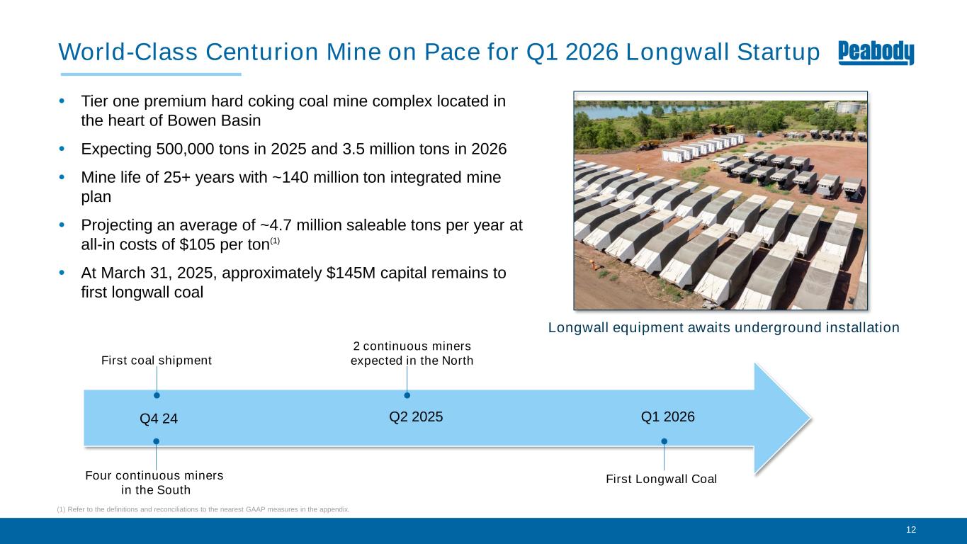 12座世界级的Centurion矿正在为2026年第一季度进行建设,Longwall Startup •位于Bowen盆地中心的一级优质硬焦煤矿综合体•预计2025年为50万吨,2026年为350万吨•矿山寿命为25年以上,综合矿山计划约为1.4亿吨•预计平均每年可销售吨约为470万吨,总成本为每吨105美元(1)•截至2025年3月31日,约有1.45亿美元的资本尚待First Longwall Coal Longwall Equipment等待地下安装(1)参考附录中的定义和与最接近的GAAP衡量标准的对账。Q4 24首次煤炭发运南方4家连续开采商Q1 2026Q2 20252家连续开采商预计北方首次长壁煤炭