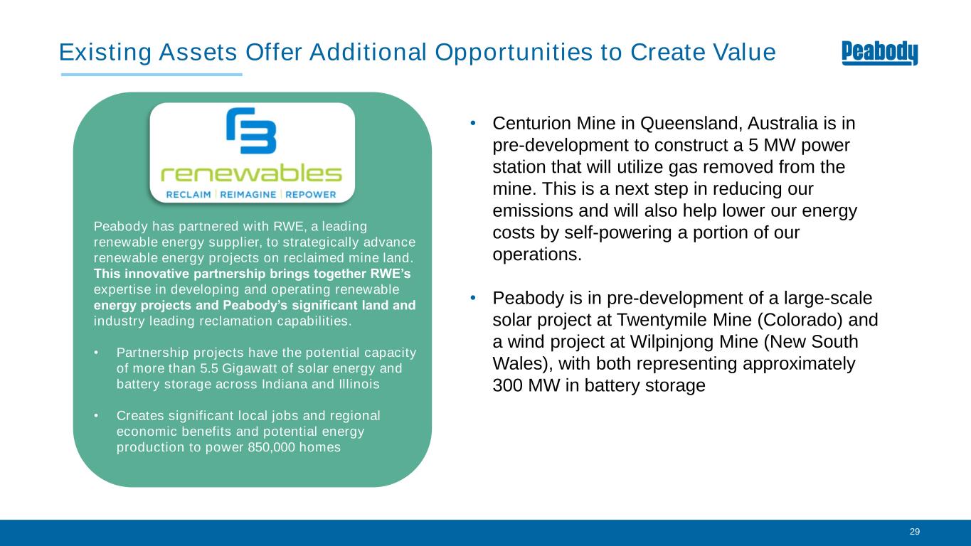 28 Peabody的业务部门(1)矿山2024年全年Seaborne Metallurgical • Centurion • Shoal Creek • Metropolitan • Coppabella/Moorvale(CMJV)•售出吨数(百万)•每吨收入•每吨成本•每吨调整后EBITDA利润率•调整后EBITDA(百万)7.3美元144.97美元122.77美元22.20美元242.5美元Seaborne Thermal • Wilpinjong • Wambo Underground • Wambo OC JV •售出吨数(百万)•每吨收入•每吨成本•每吨调整后EBITDA利润率•调整后EBITDA(百万)16.4美元73.88美元47.71美元26.71美元26.17美元430.0美元粉河流域•北羚羊罗谢尔• Caballo •生皮•吨已售(百万)•每吨收入•每吨成本•每吨调整后EBITDA利润率•调整后EBITDA(百万)79.6美元13.81美元12.07美元1.74美元138.6美元其他美国热能•熊跑• Francisco Underground • Wild Boar • Gateway North • Twentymile • El Segundo/Lee Ranch •已售吨(百万)•每吨收入•每吨成本•每吨调整后EBITDA利润率•调整后EBITDA(百万)14.6美元56.38美元46.04美元10.34美元150.8(1)所有统计数据均为截至2024年12月31日止年度。参考附录中与最接近的GAAP衡量标准的定义和调节。