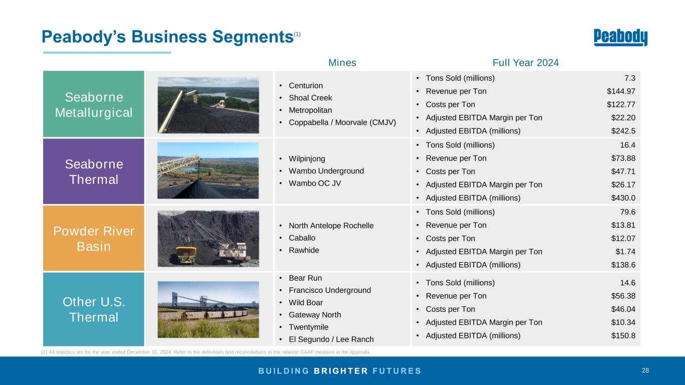 27运营概览:其他美国热力部门的产量按份额计算为2024年全年。储量反映截至2024年12月31日的估计探明储量和概略储量。战略优势:定位服务于成本运营有竞争力、储量/资源充裕的煤炭高利用率区域区域区域客户贝尔润矿产量:500.00万吨储量:6900万吨类型:地面-拖缆、推土机/铸件、卡车/铲子产品:热~11000 BTU/lb,4.5lbs。SO2铁路:Indiana Railroad到Indiana Southern/NS或CSX地点:Indiana Wild Boar Mine产量:180万吨储量:1200万吨类型:地面-推土机/铸件,卡车/铲子产品:热~11000 BTU/lb,5.0lbs。SO2轨道:NS或印第安纳州南部位置:印第安纳州弗朗西斯科地下产量:160万吨储量:200万吨类型:地下-连续矿机产品:热~11,500 BTU/lb,6.0 lbs。SO2 Rail:NS位置:Indiana Gateway North矿山产量:210万吨储量:2200万吨类型:地下–连续矿机产品:热~11000 BTU/lb,5.4lbs。SO2 Rail:UP地点:伊利诺伊州Twentymile矿产量:100万吨储量:900万吨类型:地下– Longwall产品:热~11,200 BTU/lb.,0.80 lbs。SO2 Rail:UP地点:Colorado El Segundo/Lee Ranch矿山产量:240万吨储量:800万吨类型:地面-推土机/铸件,卡车/铲子产品:热~9,250 BTU/lb,2.0lbs。SO2铁路:BNSF地点:新墨西哥州