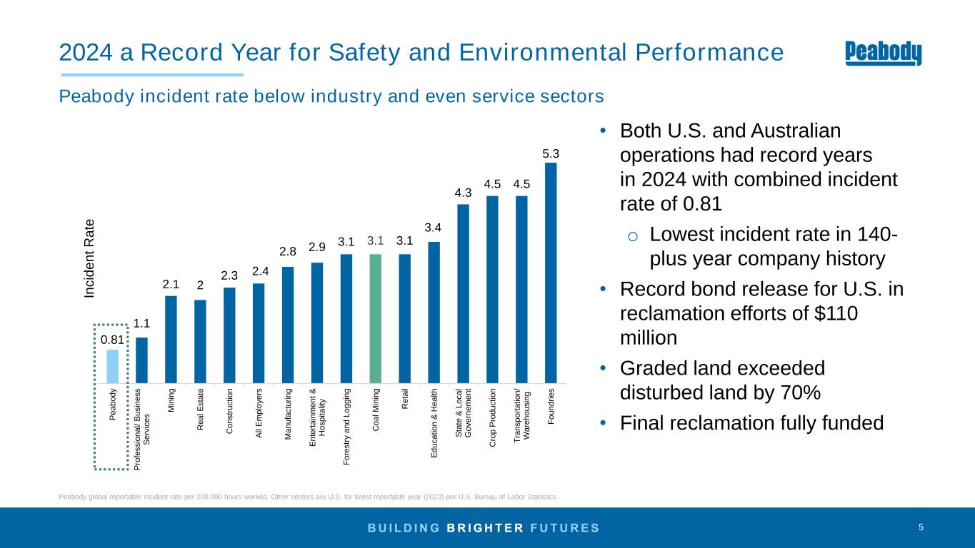 52024年是安全创纪录的一年和环境绩效1.1 2.12 2.3 2.4 2.8 2.9 3.1 3.4 4.34.3 4.54.55.3 0.81 3.1 P e a b o d y p ro fe s s io n a l/b u s in e s s s s e rv ic e s m in g r e a l e s ta te c o n s tr u c ti o n a ll e m p lo y e rs m a n u fa c tu ri n g e t rt a in m e n t &H o s p it a lit y f o re s tr y a n d l o g g in g c o a l m in g r e ta il e d u c a ti o n & h e a lt h s ta te & l o c a l g o v e rn e m e n t c r p p r d u c ti o n t ra n s p o rt a ti o n/w a re h o s ing F o u n d ri e s in c id e n t R a te Peabody global reportable incident rate per 200,000 hours work。根据美国劳工统计局的数据,其他行业是美国最近一个可报告年度(2023年)。•美国和澳大利亚的业务在2024年都创下了创纪录的年份,综合事故率为0.81 o是140多年公司历史上的最低事故率•为美国在填海努力中发行了创纪录的1.1亿美元债券•等级土地超过受干扰土地70% •最终填海完全资助的皮博迪事故率低于工业甚至服务业