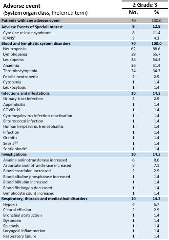 所有TEAEs ≥ 3级不分关联性研究治疗。不良事件使用医学词典进行编码以进行监管活动。等级根据美国国家癌症研究所不良事件通用术语标准5.0版确定。CRS和ICANS的等级是根据CARTOX标准确定的(Neelapu等人,2019年)。每个不良事件和严重程度分类仅统计一次患者。基于从开放临床数据库中提取的中期数据(2024年8月23日);