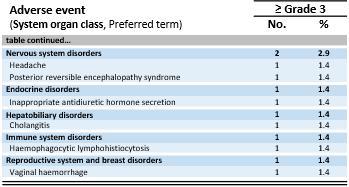 安全数据。安全人群包括701在所有剂量水平和所有肿瘤类型的试验的1a期剂量递增和1b期剂量扩展部分中的患者。所有患者均观察到≥ 3级治疗中出现的不良事件(“TEAEs”)。如下表所示,最常见的不良事件是与淋巴耗竭相关的预期血细胞减少(1-4级),以及大多数是轻度至中度细胞因子释放综合征(“CRS”)。一些患者很少经历免疫效应细胞相关神经毒性综合征(“ICANS”)(1级:6%的患者,2级:4%的患者,3级:4%的患者)。在安全人群中未观察到5级治疗相关的不良事件,即使剂量高达~10x109TCR-T细胞。1b期黑色素瘤亚群中的耐受性特征与完整的IMA203单药治疗耐受性特征大体一致。