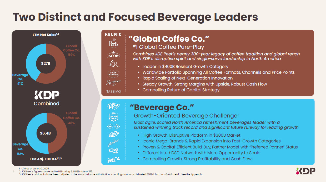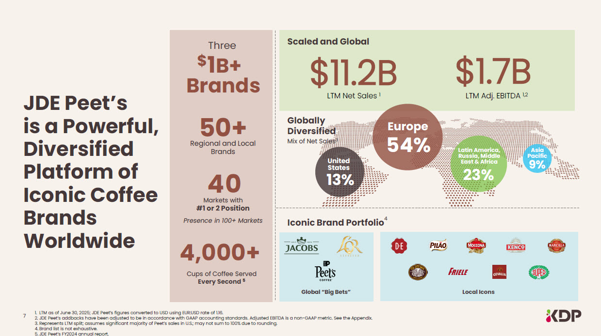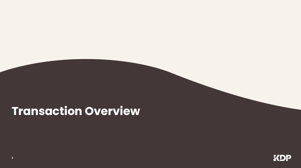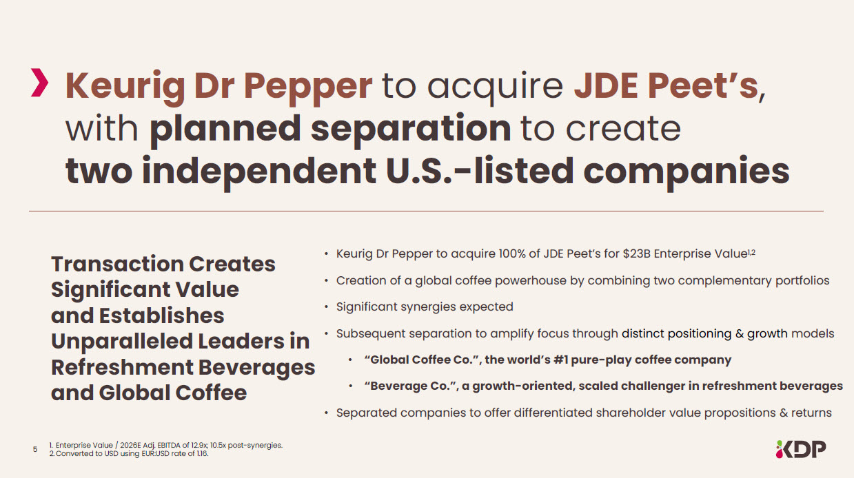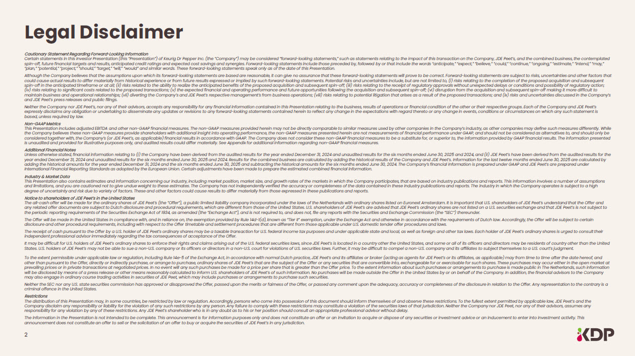 关于前瞻性信息的警示性声明Keurig Dr Pepper Inc.(“公司”)本次投资者介绍会(“介绍会”)中的某些陈述可能被视为“前瞻性陈述”,例如有关此次交易对公司、JDE Peet以及合并后业务的影响、预期的分拆、未来的财务目标和结果、预期的信用评级以及预期的成本节约和协同效应的陈述。前瞻性陈述包括前面、后面或包含“预期”、“预期”、“相信”、“可能”、“继续”、“正在进行中”、“估计”、“打算”、“可能”、“计划”、“潜力”、“项目”、“应该”、“目标”、“将”、“将”和类似词语的陈述。这些前瞻性陈述仅在本演示文稿发布之日发表。尽管该公司认为其前瞻性陈述所依据的假设是合理的,但它不能保证这些前瞻性陈述将被证明是正确的。前瞻性陈述受风险、不确定性和其他因素的影响,这些因素可能导致实际结果与历史经验或此类前瞻性陈述明示或暗示的未来结果存在重大差异。潜在风险和不确定性包括但不限于,(i)与在预期时间范围内完成拟议收购和随后分拆有关的风险或根本没有风险;(ii)与实现拟议收购和随后分拆的预期收益的能力有关的风险;(iii)与在没有意外延迟或条件的情况下收到监管批准以及监管行动的可能性有关的风险;(iv)与拟议交易相关的重大成本有关的风险;(v)收购和随后分拆后的预期财务和经营业绩以及未来机会;(vi)收购造成的干扰以及随后的分拆使得维持业务和运营关系变得更加困难;(vii)将公司和JDE Peet各自的管理层从业务运营中分流;(viii)与拟议交易产生的潜在诉讼有关的风险;以及(ix)公司和JDE Peet的新闻稿和公开文件中讨论的风险和不确定性。本公司、JDE Peet或其任何顾问均不对本演示文稿中包含的与其他或其各自集团的业务、经营业绩或财务状况有关的任何财务信息承担任何责任。除非法律要求,否则公司和JDE Peet均明确表示不承担任何义务或承诺传播对此处包含的任何前瞻性陈述的任何更新或修订,以反映与此相关的预期的任何变化或任何此类陈述所依据的事件、条件或情况的任何变化。非GAAP指标本演示文稿包括调整后的EBITDA和其他非GAAP财务指标。本文提供的非GAAP衡量标准可能无法直接与公司所处行业的其他公司使用的类似衡量标准进行比较,因为其他公司可能会对此类衡量标准进行不同的定义。虽然公司认为这些非GAAP衡量标准为股东提供了更多关于经营业绩的洞察力,但此处介绍的非GAAP衡量标准不是GAAP下财务业绩的衡量标准,不应被视为公司(或JDE Peet,如适用)根据GAAP的财务业绩的替代品,仅应与其一起考虑。公司不认为这些非GAAP财务指标可以替代或优于GAAP财务业绩提供的信息。所提供的信息未经审计,仅供说明之用,经审计的结果可能存在重大差异。有关非GAAP财务指标的更多信息,请参见附录。除非另有说明,有关(i)公司的财务资料来自截至2024年12月31日止年度的经审核业绩及截至2025年6月30日及2024年6月30日止六个月的未经审核业绩,及(ii)JDE Peet的财务资料来自截至2024年12月31日止年度的经审核业绩及截至2025年6月30日及2024年6月30日止六个月的未经审核业绩。合并后业务的业绩是通过将公司和JDE Peet的历史业绩相加计算得出的。截至2025年6月30日止最后十二个月的资料,计算方法是将截至2024年12月31日止年度及截至2025年6月30日止六个月的历史金额相加,再减去截至6月30日止六个月的历史金额, 2024.该公司的财务信息是根据公认会计原则编制的,JDE Peet的财务信息是根据欧盟采用的国际财务报告准则编制的。为编制估计的合并财务资料作出了某些调整。行业和市场数据本演示文稿还包含基于行业出版物和报告的有关我们行业的估计和信息,包括市场地位、市场规模以及公司参与的市场的增长率。这些信息涉及许多假设和限制,请注意不要过度重视这些估计。公司未对这些行业出版物和报告所载数据的准确性或完整性进行独立验证。公司所处行业受多种因素影响,具有较高的不确定性和风险性。这些因素和其他因素可能导致结果与这些出版物和报告中表达的结果大不相同。致美国JDE Peet’s股东的通知全现金要约将针对JDE Peet’s的普通股(“要约”)提出,JDE Peet’s是一家根据荷兰法律注册成立的公共有限责任公司,拥有在阿姆斯特丹泛欧交易所上市的普通股。重要的是,JDE Peet的美国股东应了解,要约和任何相关要约文件受荷兰披露和程序要求的约束,这些要求与美国的不同。JDE Peet’s的美国股东请注意,JDE Peet’s的普通股未在美国证券交易所上市,JDE Peet’s不受经修订的1934年《证券交易法》(“《交易法》”)的定期报告要求的约束,无需也不会根据该规定向美国证券交易委员会(“SEC”)提交任何报告。要约将在美国根据《交易法》和荷兰法律要求遵守并依赖规则14d-1(d)提供的豁免,即所谓的“Tier II”豁免。因此,要约将受到某些披露和其他程序要求的约束,包括与根据美国国内要约收购程序和法律适用的要约时间表和结算程序不同的要约时间表和结算程序。JDE Peet普通股的美国持有人根据要约收到现金可能是美国联邦所得税目的和适用的州和地方以及外国和其他税法规定的应税交易。我们敦促JDE Peet普通股的每位持有人立即就接受要约的税务后果咨询其独立专业顾问。JDE Peet普通股的美国持有人可能难以执行其因美国联邦证券法而产生的权利和索赔,因为JDE 