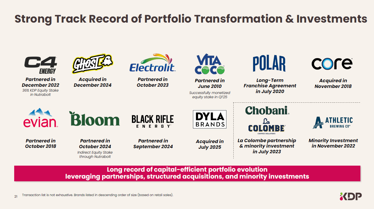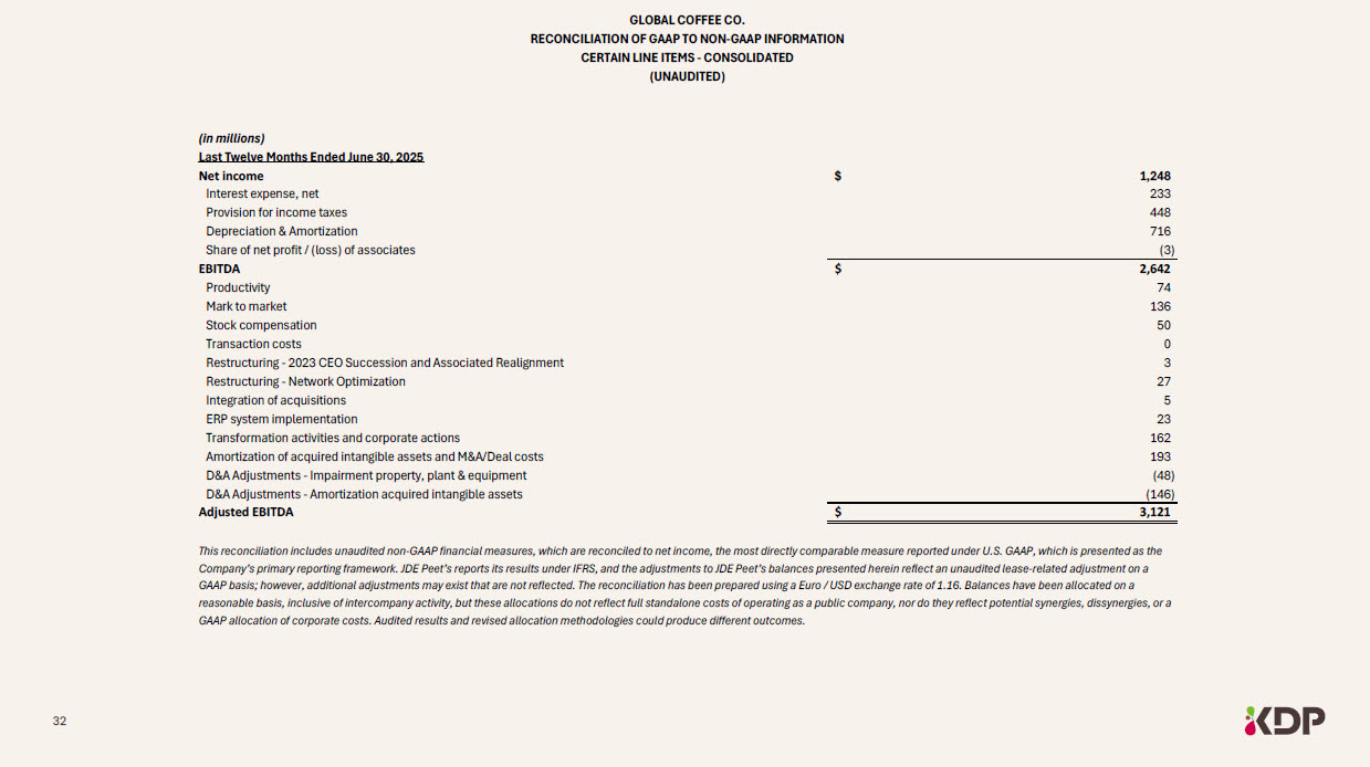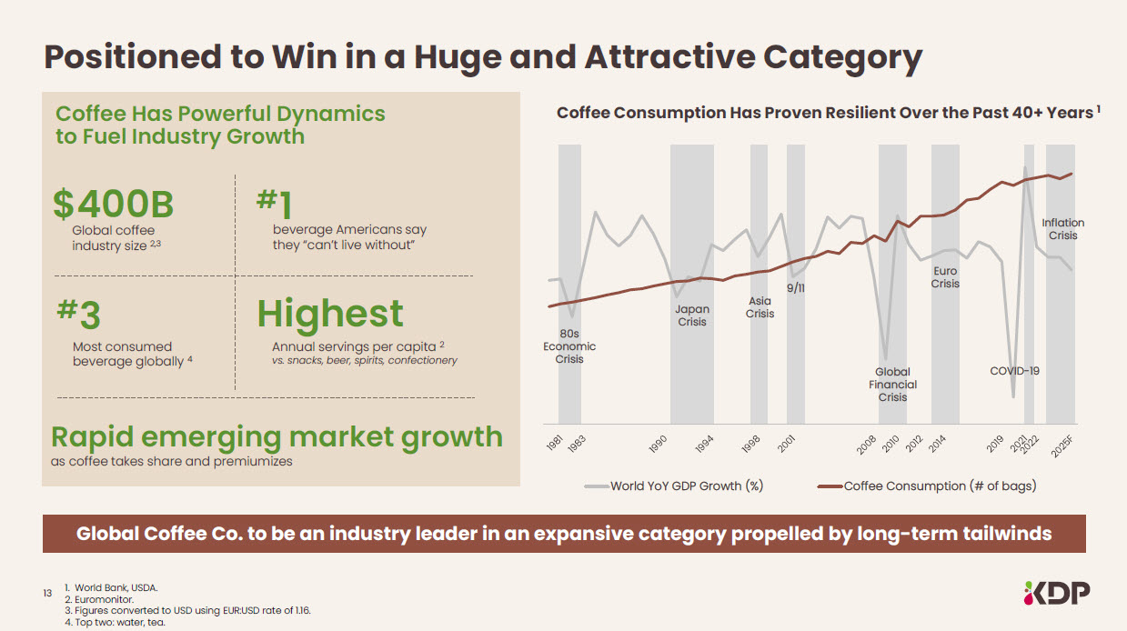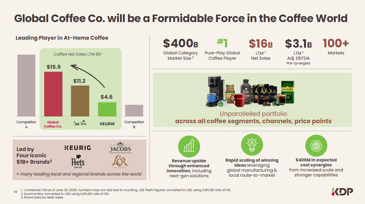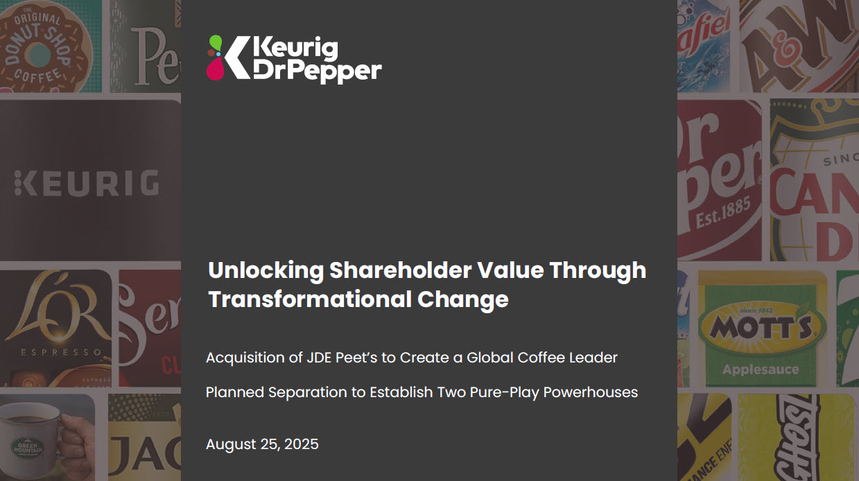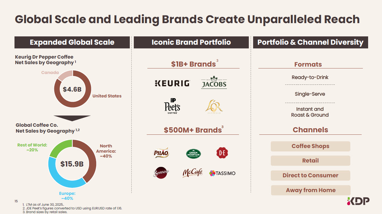 关于前瞻性信息的警示性声明Keurig Dr Pepper Inc.(“公司”)本次投资者介绍会(“介绍会”)中的某些陈述可能被视为“前瞻性陈述”,例如有关此次交易对公司、JDE Peet以及合并后业务的影响、预期的分拆、未来的财务目标和结果、预期的信用评级以及预期的成本节约和协同效应的陈述。前瞻性陈述包括前面、后面或包含“预期”、“预期”、“相信”、“可能”、“继续”、“正在进行中”、“估计”、“打算”、“可能”、“计划”、“潜力”、“项目”、“应该”、“目标”、“将”、“将”和类似词语的陈述。这些前瞻性陈述仅在本演示文稿发布之日发表。尽管该公司认为其前瞻性陈述所依据的假设是合理的,但它不能保证这些前瞻性陈述将被证明是正确的。前瞻性陈述受风险、不确定性和其他因素的影响,这些因素可能导致实际结果与历史经验或此类前瞻性陈述明示或暗示的未来结果存在重大差异。潜在风险和不确定性包括但不限于,(i)与在预期时间范围内完成拟议收购和随后分拆有关的风险或根本没有风险;(ii)与实现拟议收购和随后分拆的预期收益的能力有关的风险;(iii)与在没有意外延迟或条件的情况下收到监管批准以及监管行动的可能性有关的风险;(iv)与拟议交易相关的重大成本有关的风险;(v)收购和随后分拆后的预期财务和经营业绩以及未来机会;(vi)收购造成的干扰以及随后的分拆使得维持业务和运营关系变得更加困难;(vii)将公司和JDE Peet各自的管理层从业务运营中分流;(viii)与拟议交易产生的潜在诉讼有关的风险;以及(ix)公司和JDE Peet的新闻稿和公开文件中讨论的风险和不确定性。本公司、JDE Peet或其任何顾问均不对本演示文稿中包含的与其他或其各自集团的业务、经营业绩或财务状况有关的任何财务信息承担任何责任。除非法律要求,否则公司和JDE Peet均明确表示不承担任何义务或承诺传播对此处包含的任何前瞻性陈述的任何更新或修订,以反映与此相关的预期的任何变化或任何此类陈述所依据的事件、条件或情况的任何变化。非GAAP指标本演示文稿包括调整后的EBITDA和其他非GAAP财务指标。本文提供的非GAAP衡量标准可能无法直接与公司所处行业的其他公司使用的类似衡量标准进行比较,因为其他公司可能会对此类衡量标准进行不同的定义。虽然公司认为这些非GAAP衡量标准为股东提供了更多关于经营业绩的洞察力,但此处介绍的非GAAP衡量标准不是GAAP下财务业绩的衡量标准,不应被视为公司(或JDE Peet,如适用)根据GAAP的财务业绩的替代品,仅应与其一起考虑。公司不认为这些非GAAP财务指标可以替代或优于GAAP财务业绩提供的信息。所提供的信息未经审计,仅供说明之用,经审计的结果可能存在重大差异。有关非GAAP财务指标的更多信息,请参见附录。除非另有说明,有关(i)公司的财务资料来自截至2024年12月31日止年度的经审核业绩及截至2025年6月30日及2024年6月30日止六个月的未经审核业绩,及(ii)JDE Peet的财务资料来自截至2024年12月31日止年度的经审核业绩及截至2025年6月30日及2024年6月30日止六个月的未经审核业绩。合并后业务的业绩是通过将公司和JDE Peet的历史业绩相加计算得出的。截至2025年6月30日止最后十二个月的资料,计算方法是将截至2024年12月31日止年度及截至2025年6月30日止六个月的历史金额相加,再减去截至6月30日止六个月的历史金额, 2024.该公司的财务信息是根据公认会计原则编制的,JDE Peet的财务信息是根据欧盟采用的国际财务报告准则编制的。为编制估计的合并财务资料作出了某些调整。行业和市场数据本演示文稿还包含基于行业出版物和报告的有关我们行业的估计和信息,包括市场地位、市场规模以及公司参与的市场的增长率。这些信息涉及许多假设和限制,请注意不要过度重视这些估计。公司未对这些行业出版物和报告所载数据的准确性或完整性进行独立验证。公司所处行业受多种因素影响,具有较高的不确定性和风险性。这些因素和其他因素可能导致结果与这些出版物和报告中表达的结果大不相同。致美国JDE Peet’s股东的通知全现金要约将针对JDE Peet’s的普通股(“要约”)提出,JDE Peet’s是一家根据荷兰法律注册成立的公共有限责任公司,拥有在阿姆斯特丹泛欧交易所上市的普通股。重要的是,JDE Peet的美国股东应了解,要约和任何相关要约文件受荷兰披露和程序要求的约束,这些要求与美国的不同。JDE Peet’s的美国股东请注意,JDE Peet’s的普通股未在美国证券交易所上市,JDE Peet’s不受经修订的1934年《证券交易法》(“《交易法》”)的定期报告要求的约束,无需也不会根据该规定向美国证券交易委员会(“SEC”)提交任何报告。要约将在美国根据《交易法》和荷兰法律要求遵守并依赖规则14d-1(d)提供的豁免,即所谓的“Tier II”豁免。因此,要约将受到某些披露和其他程序要求的约束,包括与根据美国国内要约收购程序和法律适用的要约时间表和结算程序不同的要约时间表和结算程序。JDE Peet普通股的美国持有人根据要约收到现金可能是美国联邦所得税目的和适用的州和地方以及外国和其他税法规定的应税交易。我们敦促JDE Peet普通股的每位持有人立即就接受要约的税务后果咨询其独立专业顾问。JDE Peet普通股的美国持有人可能难以执行其因美国联邦证券法而产生的权利和索赔,因为JDE 