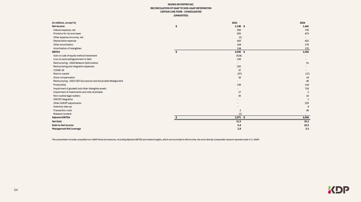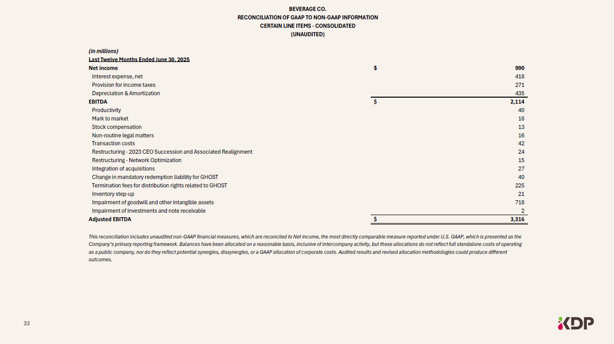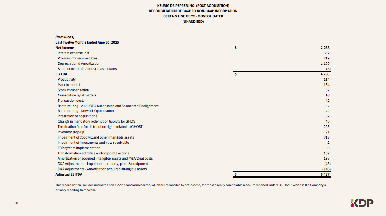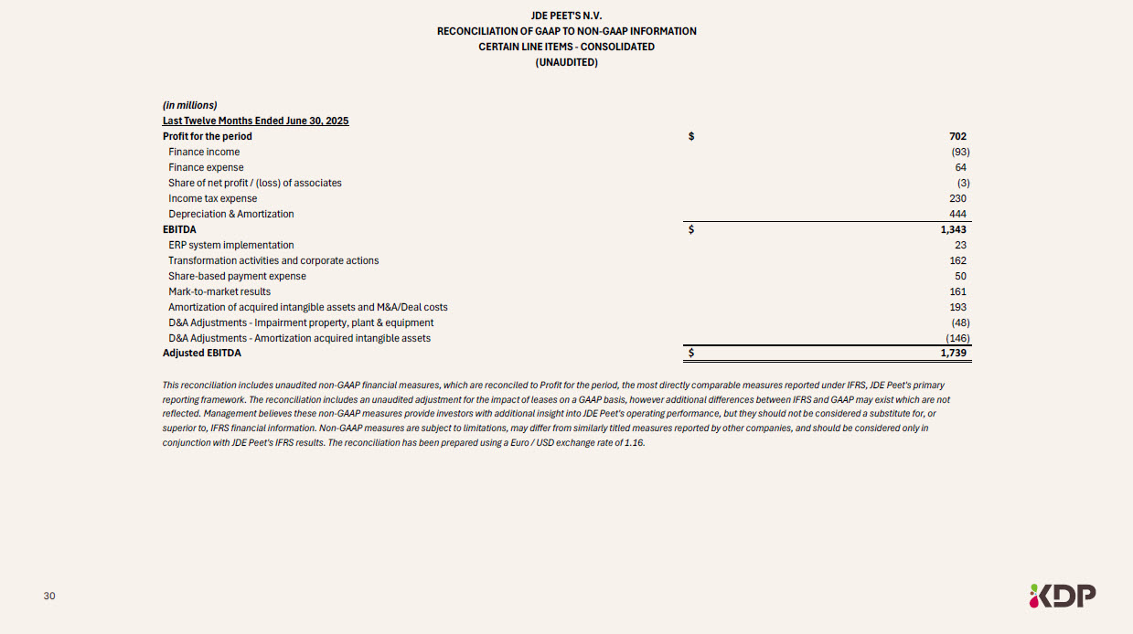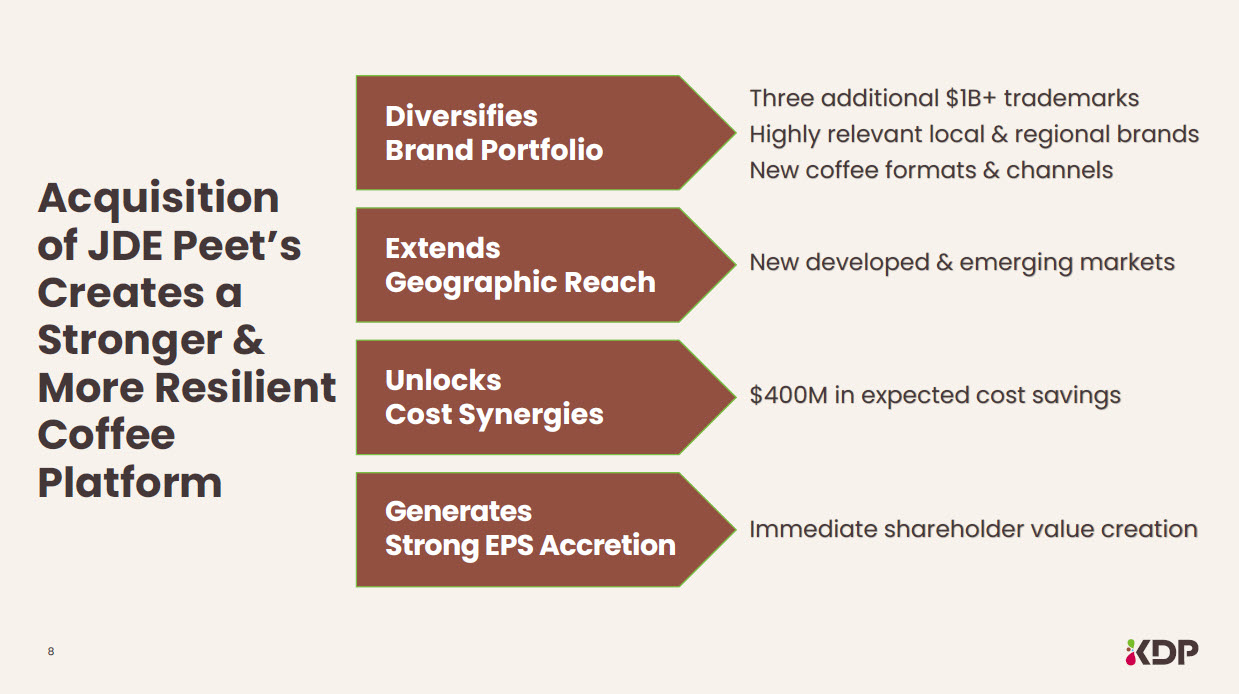 关于前瞻性信息的警示性声明Keurig Dr Pepper Inc.(“公司”)本次投资者介绍会(“介绍会”)中的某些陈述可能被视为“前瞻性陈述”,例如有关此次交易对公司、JDE Peet以及合并后业务的影响、预期的分拆、未来的财务目标和结果、预期的信用评级以及预期的成本节约和协同效应的陈述。前瞻性陈述包括前面、后面或包含“预期”、“预期”、“相信”、“可能”、“继续”、“正在进行中”、“估计”、“打算”、“可能”、“计划”、“潜力”、“项目”、“应该”、“目标”、“将”、“将”和类似词语的陈述。这些前瞻性陈述仅在本演示文稿发布之日发表。尽管该公司认为其前瞻性陈述所依据的假设是合理的,但它不能保证这些前瞻性陈述将被证明是正确的。前瞻性陈述受风险、不确定性和其他因素的影响,这些因素可能导致实际结果与历史经验或此类前瞻性陈述明示或暗示的未来结果存在重大差异。潜在风险和不确定性包括但不限于,(i)与在预期时间范围内完成拟议收购和随后分拆有关的风险或根本没有风险;(ii)与实现拟议收购和随后分拆的预期收益的能力有关的风险;(iii)与在没有意外延迟或条件的情况下收到监管批准以及监管行动的可能性有关的风险;(iv)与拟议交易相关的重大成本有关的风险;(v)收购和随后分拆后的预期财务和经营业绩以及未来机会;(vi)收购造成的干扰以及随后的分拆使得维持业务和运营关系变得更加困难;(vii)将公司和JDE Peet各自的管理层从业务运营中分流;(viii)与拟议交易产生的潜在诉讼有关的风险;以及(ix)公司和JDE Peet的新闻稿和公开文件中讨论的风险和不确定性。本公司、JDE Peet或其任何顾问均不对本演示文稿中包含的与其他或其各自集团的业务、经营业绩或财务状况有关的任何财务信息承担任何责任。除非法律要求,否则公司和JDE Peet均明确表示不承担任何义务或承诺传播对此处包含的任何前瞻性陈述的任何更新或修订,以反映与此相关的预期的任何变化或任何此类陈述所依据的事件、条件或情况的任何变化。非GAAP指标本演示文稿包括调整后的EBITDA和其他非GAAP财务指标。本文提供的非GAAP衡量标准可能无法直接与公司所处行业的其他公司使用的类似衡量标准进行比较,因为其他公司可能会对此类衡量标准进行不同的定义。虽然公司认为这些非GAAP衡量标准为股东提供了更多关于经营业绩的洞察力,但此处介绍的非GAAP衡量标准不是GAAP下财务业绩的衡量标准,不应被视为公司(或JDE Peet,如适用)根据GAAP的财务业绩的替代品,仅应与其一起考虑。公司不认为这些非GAAP财务指标可以替代或优于GAAP财务业绩提供的信息。所提供的信息未经审计,仅供说明之用,经审计的结果可能存在重大差异。有关非GAAP财务指标的更多信息,请参见附录。除非另有说明,有关(i)公司的财务资料来自截至2024年12月31日止年度的经审核业绩及截至2025年6月30日及2024年6月30日止六个月的未经审核业绩,及(ii)JDE Peet的财务资料来自截至2024年12月31日止年度的经审核业绩及截至2025年6月30日及2024年6月30日止六个月的未经审核业绩。合并后业务的业绩是通过将公司和JDE Peet的历史业绩相加计算得出的。截至2025年6月30日止最后十二个月的资料,计算方法是将截至2024年12月31日止年度及截至2025年6月30日止六个月的历史金额相加,再减去截至6月30日止六个月的历史金额, 2024.该公司的财务信息是根据公认会计原则编制的,JDE Peet的财务信息是根据欧盟采用的国际财务报告准则编制的。为编制估计的合并财务资料作出了某些调整。行业和市场数据本演示文稿还包含基于行业出版物和报告的有关我们行业的估计和信息,包括市场地位、市场规模以及公司参与的市场的增长率。这些信息涉及许多假设和限制,请注意不要过度重视这些估计。公司未对这些行业出版物和报告所载数据的准确性或完整性进行独立验证。公司所处行业受多种因素影响,具有较高的不确定性和风险性。这些因素和其他因素可能导致结果与这些出版物和报告中表达的结果大不相同。致美国JDE Peet’s股东的通知全现金要约将针对JDE Peet’s的普通股(“要约”)提出,JDE Peet’s是一家根据荷兰法律注册成立的公共有限责任公司,拥有在阿姆斯特丹泛欧交易所上市的普通股。重要的是,JDE Peet的美国股东应了解,要约和任何相关要约文件受荷兰披露和程序要求的约束,这些要求与美国的不同。JDE Peet’s的美国股东请注意,JDE Peet’s的普通股未在美国证券交易所上市,JDE Peet’s不受经修订的1934年《证券交易法》(“《交易法》”)的定期报告要求的约束,无需也不会根据该规定向美国证券交易委员会(“SEC”)提交任何报告。要约将在美国根据《交易法》和荷兰法律要求遵守并依赖规则14d-1(d)提供的豁免,即所谓的“Tier II”豁免。因此,要约将受到某些披露和其他程序要求的约束,包括与根据美国国内要约收购程序和法律适用的要约时间表和结算程序不同的要约时间表和结算程序。JDE Peet普通股的美国持有人根据要约收到现金可能是美国联邦所得税目的和适用的州和地方以及外国和其他税法规定的应税交易。我们敦促JDE Peet普通股的每位持有人立即就接受要约的税务后果咨询其独立专业顾问。JDE Peet普通股的美国持有人可能难以执行其因美国联邦证券法而产生的权利和索赔,因为JDE 