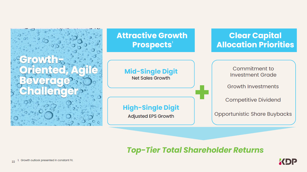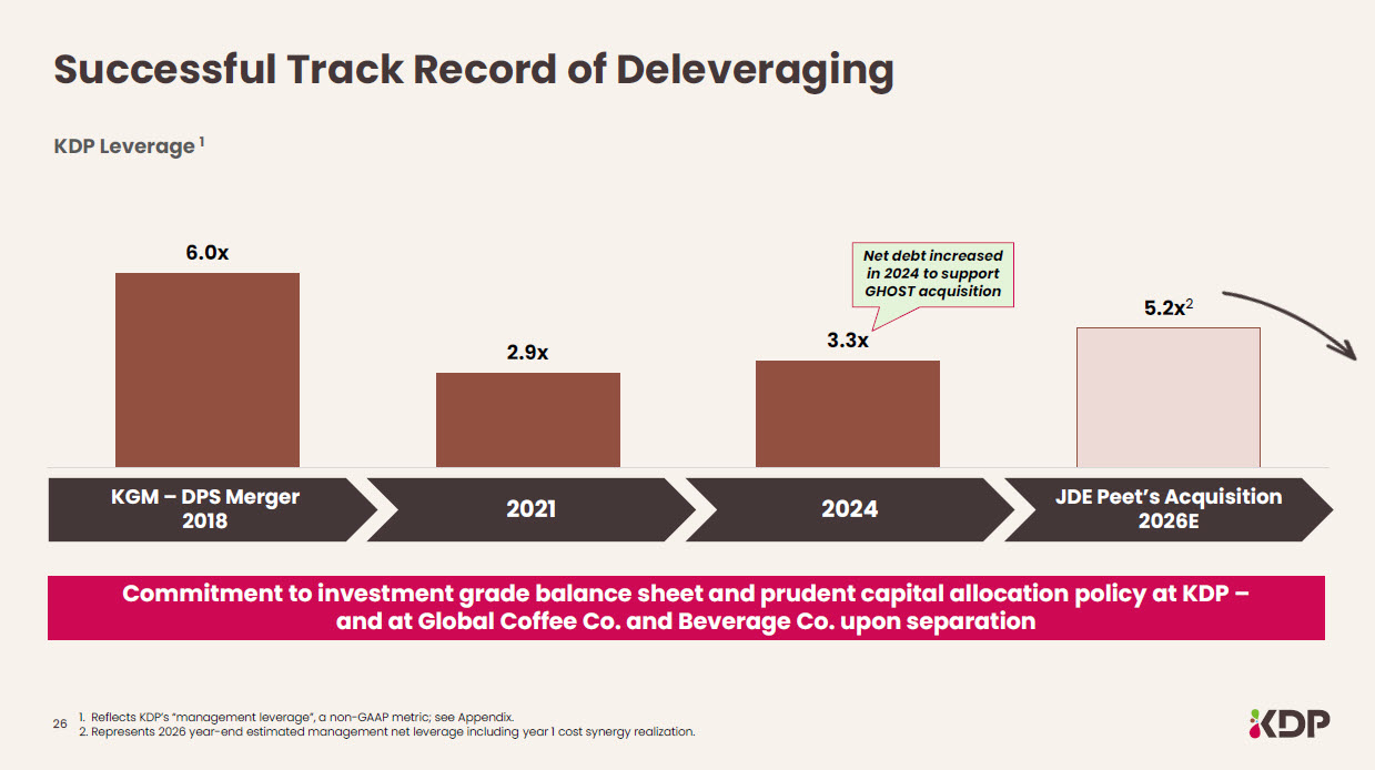 在KDP –以及在Global Coffee Co. and Beverage Co. on separation 1上对投资级资产负债表和审慎资本分配政策作出去杠杆化承诺的成功往绩记录。反映了KDP的“管理杠杆”,这是一个非GAAP指标;见附录。2.表示包括第1年成本协同增效实现在内的2026年年底估计管理净杠杆。