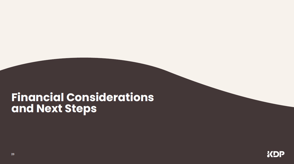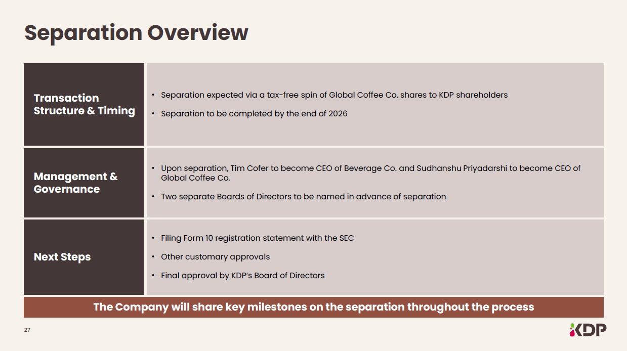 离职概览交易Structure &时间安排•预计通过将Global Coffee Co.的股份免税分拆给KDP股东进行离职•离职将于2026年底完成管理和治理•离职后,Tim Cofer将成为Beverage Co.的首席执行官,Sudhanshu Priyadarshi将成为Global Coffee Co.的首席执行官。•两个独立的董事会将在离职前任命下一步•向SEC提交表格10登记声明•其他惯常批准• KDP董事会的最终批准公司将在整个过程中分享关于离职的关键里程碑