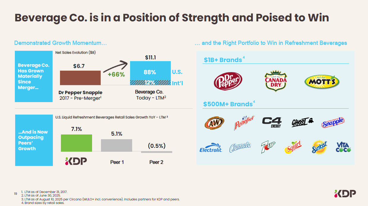 Beverage Co.处于强势地位,蓄势待发,将赢得Vita Coco原味椰子水-1 L纸箱1。LTM截至2017年12月31日。2.LTM截至2025年6月30日。3.LTM截至2025年8月10日per Circana(MULO + incl.convenience)。包括KDP的合作伙伴和同行。4.按零售额划分的品牌规模。展示了增长势头……以及在茶点饮料中赢得5亿美元以上品牌的正确投资组合