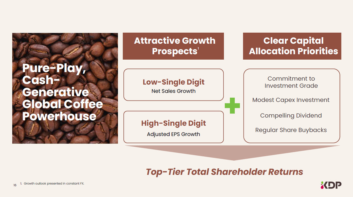 承诺投资级净销售额增长低个位数高个位数调整后每股收益增长迫使股息定期股票回购适度的资本支出投资纯粹发挥、产生现金的全球咖啡强国顶级总股东回报1。以不变外汇呈现的增长前景。