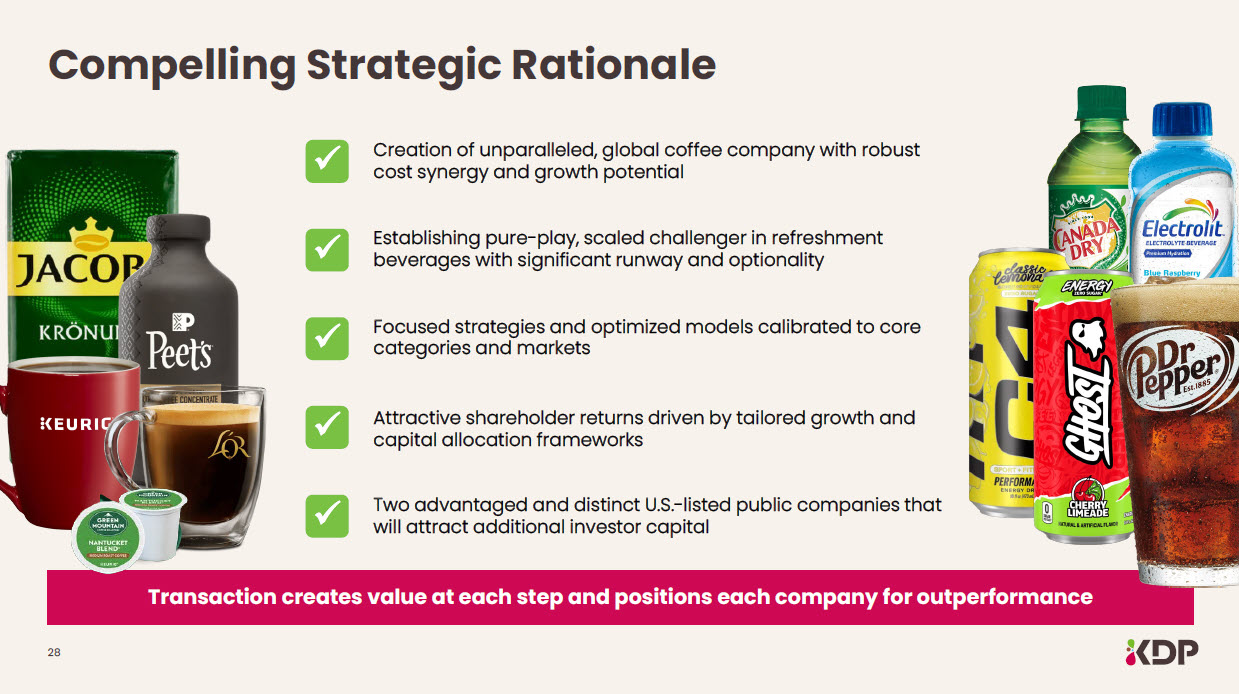 令人信服的战略理由创造无与伦比的、具有强大成本协同效应和增长潜力的全球咖啡公司专注于战略和优化模型,并根据核心品类和市场进行校准,在具有显着跑道和可选性的茶点饮料领域建立纯粹的、规模化的挑战者,在量身定制的增长和资本分配框架的推动下实现有吸引力的股东回报两家具有优势和独特的美国上市上市上市上市公司,将吸引更多的投资者资本