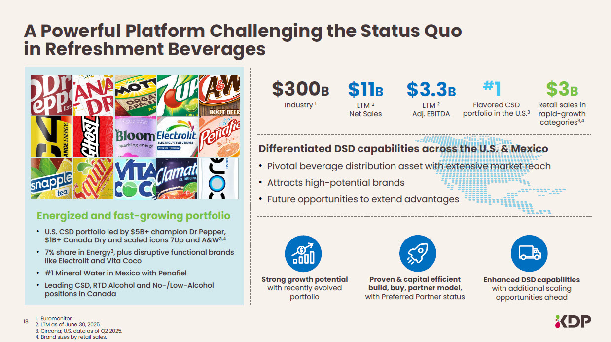 挑战茶点饮料现状的强大平台在美国和墨西哥利用差异化的DSD能力•具有广泛市场覆盖的关键饮料分销资产•吸引高潜力品牌•未来机会扩展优势增强的DSD能力与未来的额外扩展机会1。Euromonitor。2.LTM截至2025年6月30日。3.Circana;截至2025年第二季度的美国数据。4.按零售额划分的品牌规模。