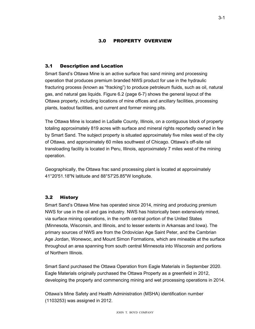 3-1 JOHN T. BOYD COMPANY 3.0 Property Overview3.1说明和位置Smart Sand的渥太华矿山是一个活跃的地表压裂砂开采和加工作业,生产用于水力压裂过程(称为“压裂”)以生产石油流体(例如石油、天然气和天然气液体)的优质品牌NWS产品。图6.2(第6-7页)显示了渥太华财产的总体布局,包括矿山办公室和附属设施、加工厂、装卸设施以及现在和以前的采矿坑的位置。渥太华矿场位于伊利诺伊州拉萨尔县,位于一块总面积约为819英亩的毗连矿区,据报道该矿区的地表和矿权由Smart Sand有偿拥有。标的物业位于渥太华以西约5英里处,芝加哥西南约60英里处。渥太华的场外铁路转运设施位于伊利诺伊州的秘鲁,位于采矿作业以西约7英里处。地理位置上,渥太华压裂砂加工厂位于北纬约41 ° 20‘51.18“,西经约88 ° 57’25.85”。3.2历史Smart Sand的渥太华矿山自2014年开始运营,开采和生产用于石油和天然气行业的优质NWS。NWS历来通过地面采矿作业在美国中北部(明尼苏达州、威斯康星州和伊利诺伊州,在较小程度上在阿肯色州和爱荷华州)进行广泛开采。NWS的主要来源是奥陶纪时代的Saint Peter,以及寒武纪时代的Jordan、Wonewoc和Mount Simon组,这些组可在从明尼苏达州中南部到威斯康星州的整个地区以及伊利诺伊州北部的部分地区的地表进行开采。Smart Sand于2020年9月从老鹰材料购买了Ottawa Operation。老鹰材料最初于2012年购买渥太华物业作为绿地,于2014年开发该物业并开始采矿和湿法加工业务。渥太华矿山安全与健康管理局(MSHA)识别号(1103253)于2012年分配。