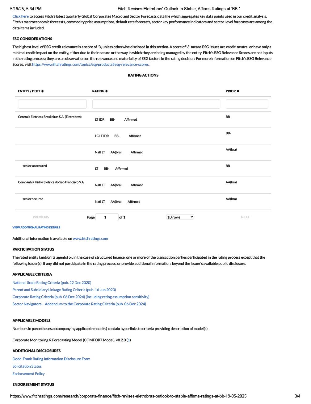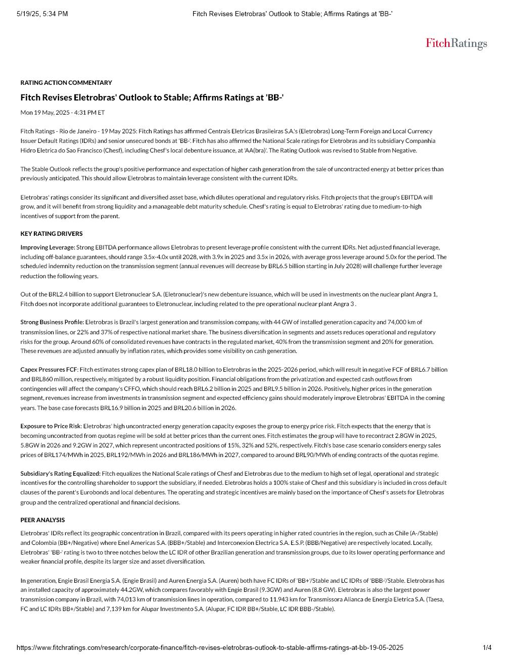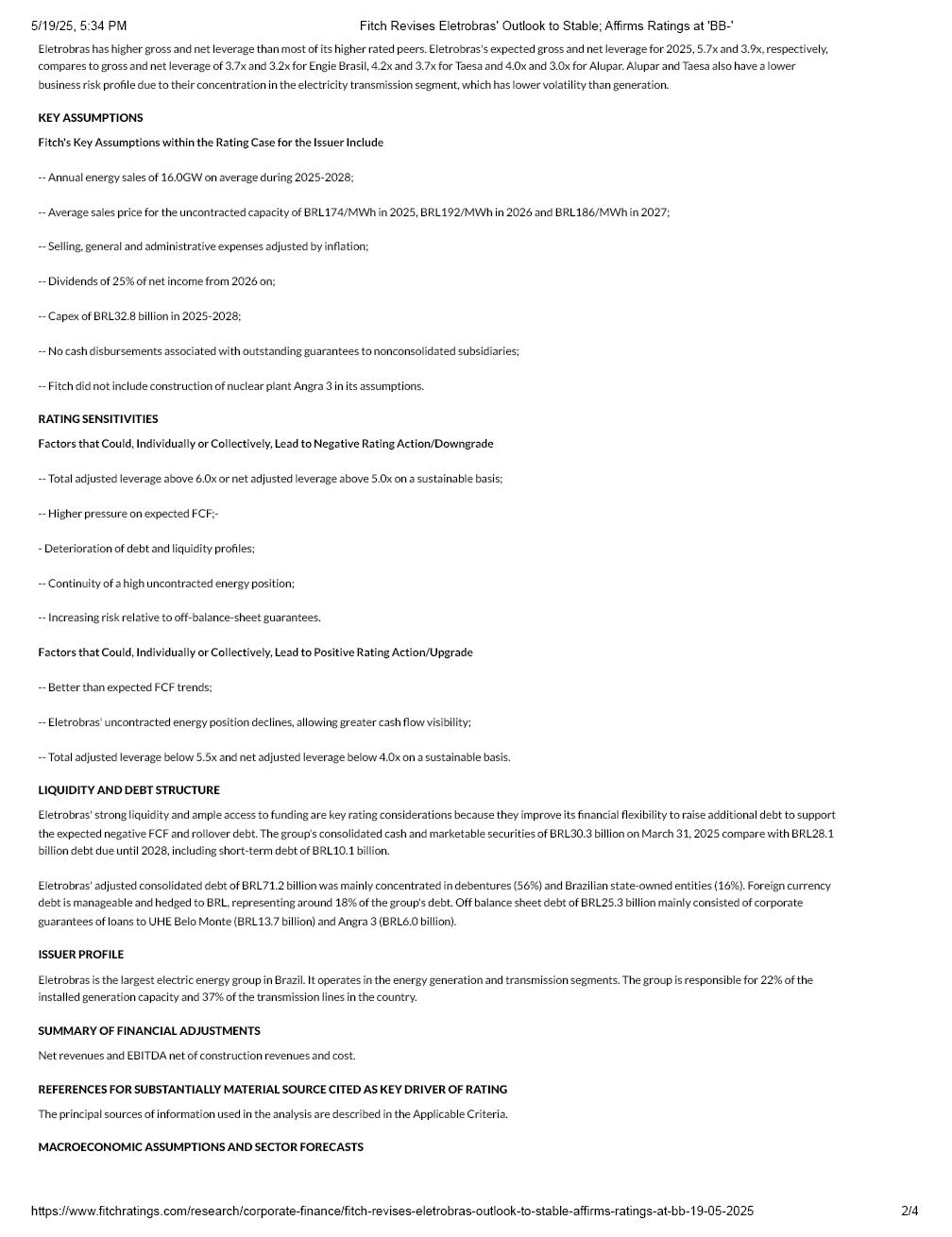 评级行动评论惠誉将Eletrobras的前景下修至稳定;确认评级为‘BB-’美国东部时间2025年5月19日星期一-下午4:31惠誉评级-里约热内卢-2025年5月19日:惠誉评级已确认Centrais Eletricas Brasileiras S.A.(Eletrobras)的长期外国和本币发行人违约评级(IDRS)和高级无担保债券为‘BB-’。惠誉还确认了Eletrobras及其子公司CompanhiaHidro Eletrica do San Francisco(Chesf)的国家规模评级,包括Chesf在当地发行的债券,评级为‘AA(bra)’。评级展望由负面上修至稳定。稳定的展望反映了集团积极的业绩表现,以及预期以比先前预期更好的价格出售非合同能源产生更高的现金。这应该允许Eletrobras保持与当前IDR一致的杠杆。Eletrobras的评级考虑了其重要且多元化的资产基础,这稀释了运营和监管风险。惠誉预计,该集团的EBITDA将增长,它将受益于强劲的流动性和可控的债务到期时间表。Chesf的评级与Eletrobras的评级持平,原因是来自母公司的中高激励支持。提高杠杆率的关键评级驱动因素:强劲的EBITDA表现使Eletrobras能够呈现与当前IDR一致的杠杆率状况。2028年之前,包括表外担保在内的净调整后财务杠杆应该在3.5x-4.0x之间,2025年为3.9倍,2026年为3.5倍,该期间的平均毛杠杆约为5.0倍。传输部分的预定赔偿削减(从2028年7月开始,年收入将减少65亿巴西雷亚尔)将对随后几年的进一步降低杠杆提出挑战。在用于支持Eletronuclear S.A.(Eletronuclear)新发行债券的24亿雷亚尔中,该债券将用于对核电站Angra1的投资,惠誉没有为Eletronuclear纳入额外担保,包括与运营前核电站Angra3相关的担保。强劲的业务概况:Eletrobras是巴西最大的发电和输电公司,拥有44吉瓦的发电装机容量和7.4万公里的输电线路,分别占各自国家市场份额的22%和37%。分部和资产的业务多元化降低了集团的运营和监管风险。大约60%的合并收入在受监管的市场上有合同,40%来自输电部分,20%用于发电。这些收入每年都会根据通货膨胀率进行调整,这为现金产生提供了一些可见性。资本支出压力FCF:惠誉估计,2025-2026年期间向Eletrobras提供的强劲资本支出计划为180亿巴西雷亚尔,这将导致分别为67亿巴西雷亚尔和8.6亿巴西雷亚尔的负FCF,这将因稳健的流动性状况而有所缓解。私有化产生的财务义务和意外事件产生的预期现金流出将影响该公司的CFFO,2025年该公司的CFFO将达到62亿巴西雷亚尔,2026年将达到95亿巴西雷亚尔。积极的一面是,发电部门的价格上涨、输电部门投资带来的收入增加以及预期的效率提升应该会在未来几年适度改善Eletrobras的EBITDA。基本情况预测2025年为169亿巴西雷亚尔,2026年为206亿巴西雷亚尔。价格风险敞口:Eletrobras的高非合同能源发电能力使集团面临能源价格风险。惠誉预计,正在脱离配额制度的能源将以比当前更好的价格出售。惠誉估计,该集团将不得不在2026年的2025、5.8GW和2027年的9.2GW中重新签约2.8GW,这分别代表15%、32%和52%的未签约头寸。惠誉的基本情况假设假设认为,2025年的能源销售价格为174巴西雷亚尔/兆瓦时,2026年为192巴西雷亚尔/兆瓦时,2027年为186巴西雷亚尔/兆瓦时,而配额制度的期末合同价格约为90巴西雷亚尔/兆瓦时。子公司评级持平:惠誉将Chesf和Eletrobras的国家规模评级持平,原因是如果需要,控股股东支持子公司的法律、运营和战略激励措施达到了中等至高水平。Eletrobras持有ChesF 100%的股权,这家子公司被纳入母公司欧洲债券和当地债券的交叉违约条款。运营和战略激励主要基于ChesF资产对EletroBrasgroup的重要性以及集中的运营和财务决策。同行分析Eletrobras的IDR反映了其地理集中度在巴西,与在该地区较高评级国家开展业务的同行相比,例如分别位于Enel Americas S.A.(BBB +/稳定)和InterconeXion Electrica S.A. E.S.P.(BBB/负面)所在的智利(A-/稳定)和哥伦比亚(BB +/负面)。在当地,Eletrobras的BB-'评级比巴西其他发电和传输集团的LC IDR低两到三个等级, 由于其较低的经营业绩和较弱的财务状况,尽管其更大的规模和资产多样化。代,Engie Brasil Energia S.A.(Engie Brasil)和Auren Energia S.A.(Auren)的FC IDR均为‘BB +’/稳定,LC IDR均为‘BBB-’/稳定。Eletrobras HASAN装机容量约为44.2GW,优于Engie Brasil(9.3GW)和Auren(8.8GW)。Eletrobras也是巴西最大的电力传输公司,有74,013公里的输电线路在运营,相比之下,Transmissora Alianca de Energia Eletrica S.A.(Taesa,FC和LC IDRS BB +/Stable)和Alupar Investmento S.A.(Alupar,FC IDR BB +/Stable,LC IDR BBB-/Stable)分别为11.943公里和7,139公里。5/19/25,下午5:34惠誉将Eletrobras的展望修正为稳定;确认评级为‘BB-’https://www.fitchratings.com/research/corporate-finance/fitch-revises-eletrobras-outlook-to-stable-affirms-ratings-at-bb-19-05-2025 1/4 Eletrobras的毛杠杆和净杠杆高于大多数评级较高的同行。Eletrobras预计2025年的毛杠杆和净杠杆分别为5.7倍和3.9倍,而Engie Brasil的毛杠杆和净杠杆分别为3.7倍和3.2倍,Taesa为4.2倍和3.7倍,Alupar为4.0倍和3.0倍。Alupar和Taesa也有较低的业务风险状况,因为它们集中在电力传输领域,其波动性低于发电。关键假设惠誉在对发行人的评级案例中的关键假设包括—— 2025-2028年期间平均每年能源销售量为16.0GW;—— 2025年非合同产能的平均销售价格为174巴西雷亚尔/兆瓦时,2026年为192巴西雷亚尔/兆瓦时,2027年为186巴西雷亚尔/兆瓦时;——经通货膨胀调整的销售、一般和管理费用;——自2026年起,股息为净收入的25%;—— 2025-2028年资本支出为328亿巴西雷亚尔;——没有与对非合并子公司的未偿担