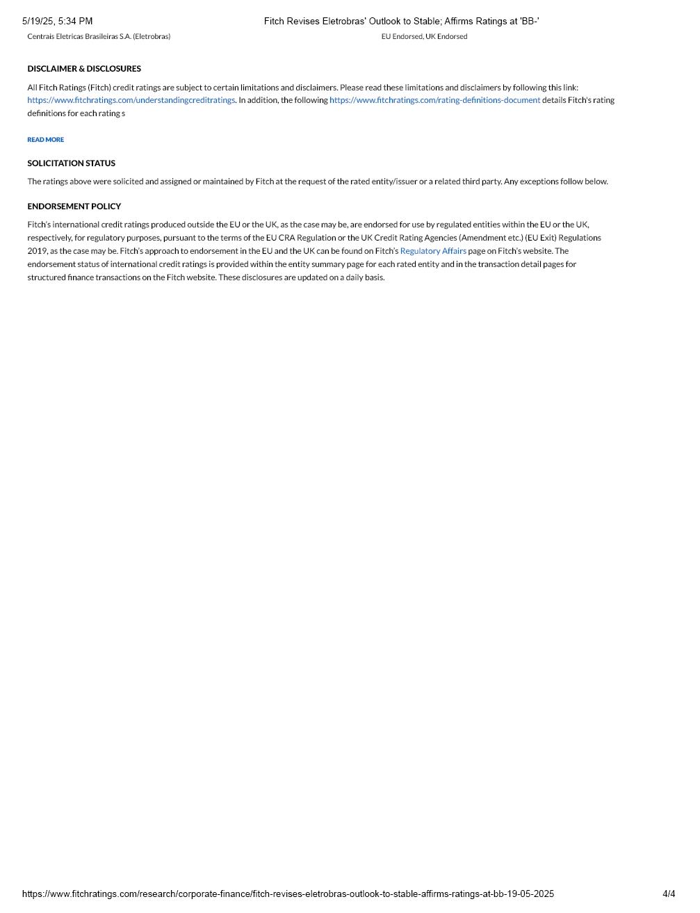 本文件可能包含的估计和预测不是对过去事件的陈述,而是反映了我们管理层的信念和预期,并且可能构成经修订的1933年《证券法》第27A条和经修订的1934年《证券交易法》第21E条规定的前瞻性陈述。“相信”、“可能”、“可以”、“估计”、“继续”、“预期”、“打算”、“预期”等类似表述旨在识别必然涉及已知和未知风险和不确定性的估计。已知的风险和不确定性包括但不限于:巴西和国外的一般经济、监管、政治和商业状况;利率波动、通货膨胀、以及巴西雷亚尔的价值;消费者用电模式和电量的变化;竞争条件;我们的负债水平;收到与我们的应收账款相关的付款的可能性;用于运营我们的水电站的水库的降雨量和水位的变化;我们的融资和资本投资计划;现有和未来的政府法规;以及我们的年度报告以及向CVM和SEC提交的其他文件中描述的其他风险。估计和预测仅指表达这些估计和预测的日期,我们不承担因新信息或未来事件而更新任何这些估计或预测的任何义务。公司运营和举措的未来结果可能与当前预期不同,投资者不应仅依赖此处包含的信息。该材料包含的计算可能由于四舍五入而无法反映精确的结果。