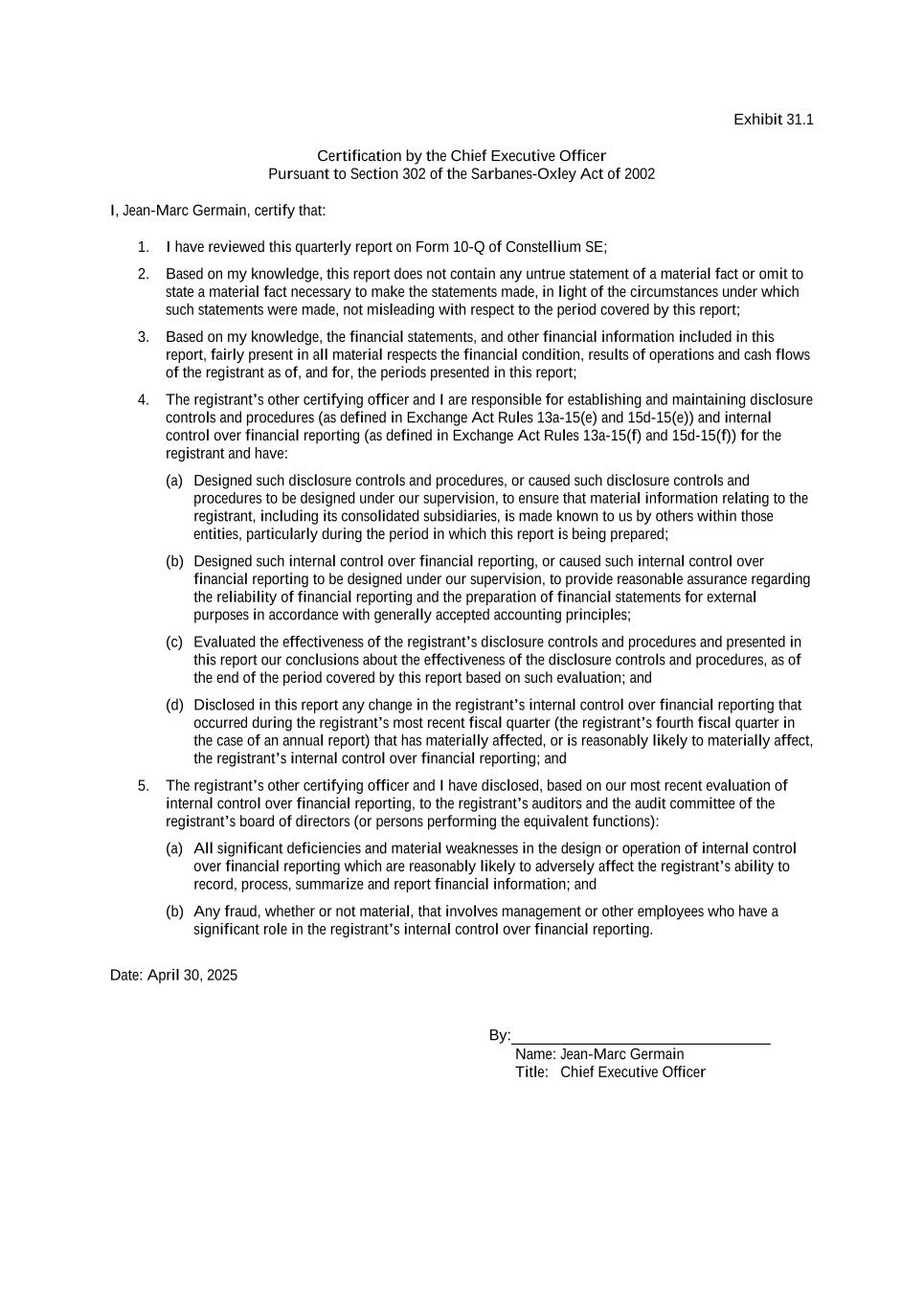 附件 31.1首席执行官根据2002年《萨班斯-奥克斯利法案》第302条进行的认证I,Jean-Marc Germain,证明:1。我已审阅了这份关于Constellium SE表格10-Q的季度报告;2。据我所知,本报告不包含任何对重大事实的不真实陈述或遗漏陈述作出所作陈述所必需的重大事实,鉴于作出此类陈述的情况,对本报告所涵盖的期间没有误导;3。根据我所知,本报告所载的财务报表和其他财务信息,在所有重大方面公允地反映了截至本报告所述期间和期间的财务状况、经营成果和登记人的现金流量;4。注册人的其他核证人和我负责为注册人建立和维护披露控制和程序(定义见《交易法》规则13a-15(e)和15d-15(e))以及财务报告内部控制(定义见《交易法》规则13a-15(f)和15d-15(f)),并已:(a)设计了此类披露控制和程序,或导致此类披露控制和程序在我们的监督下设计,以确保与注册人有关的重要信息,包括其合并子公司,由这些实体内的其他人向我们公布,特别是在本报告编写期间;(b)设计了这种财务报告内部控制,或使这种财务报告内部控制是在我们的监督下设计的,以便为财务报告的可靠性和根据公认会计原则为外部目的编制财务报表提供合理保证;(c)评估了注册人披露控制和程序的有效性,并在本报告中提出了我们关于披露控制和程序有效性的结论,截至本报告所述期间结束时基于此种评价;(d)在本报告中披露在注册人最近一个财政季度(如为年度报告,则为注册人的第四个财政季度)期间发生的对注册人财务报告内部控制产生重大影响或合理可能产生重大影响的任何变更;以及5。根据我们最近对财务报告内部控制的评估,注册人的其他认证人员和我已向注册人的审计师和注册人董事会的审计委员会(或履行同等职能的人员)披露:(a)财务报告内部控制的设计或操作中存在的所有重大缺陷和重大缺陷,这些缺陷和缺陷合理地可能会对注册人记录、处理、汇总和报告财务信息的能力产生不利影响;(b)任何欺诈行为,无论是否重大,涉及管理层或其他在注册人财务报告内部控制中具有重要作用的员工。日期:2025年4月30日作者:姓名:Jean-Marc Germain职务:首席执行官