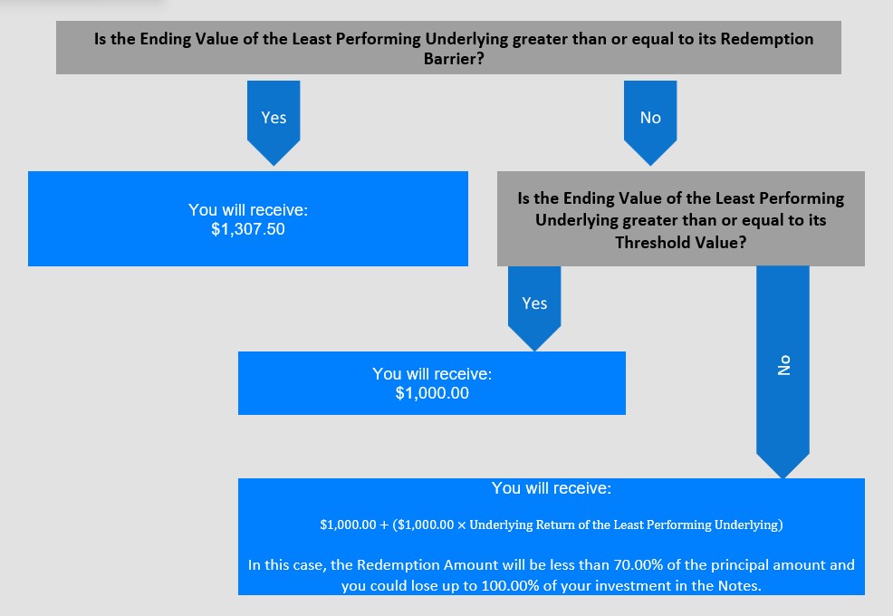 假设票据未在到期前被赎回,如果每个标的的期末价值大于或等于其起始价值的100%,到期时,您将获得每1,000.00美元票据本金金额1,307.50美元。